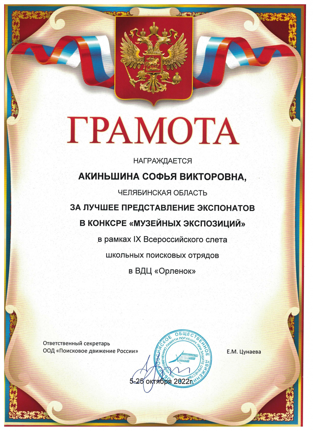 Командир Отряда «ВАРНА.ПОИСК» Софья Акиньшина стала обладателем Диплома с отличием IX Всероссийского слета поисковых отрядов и победителем конкурса музейных экспозиций.