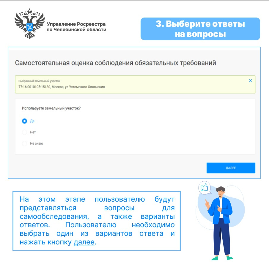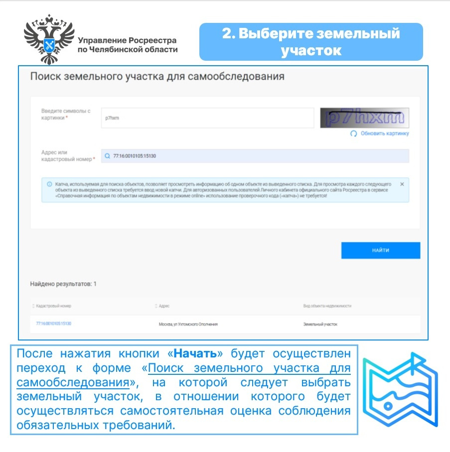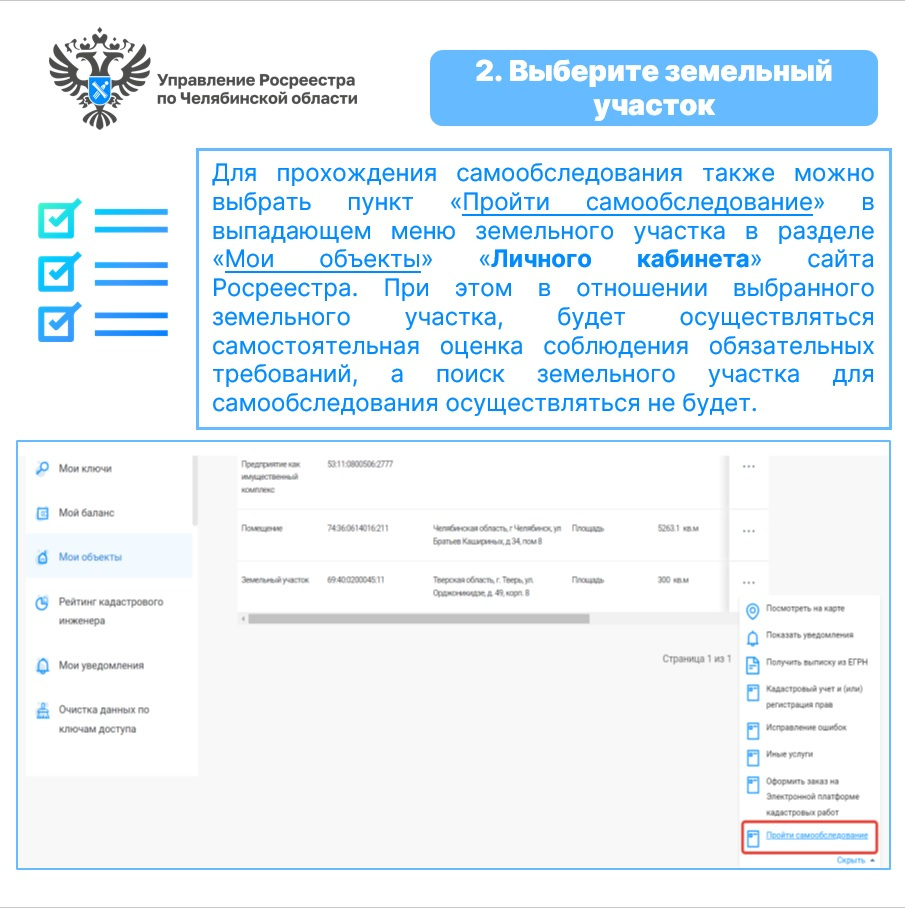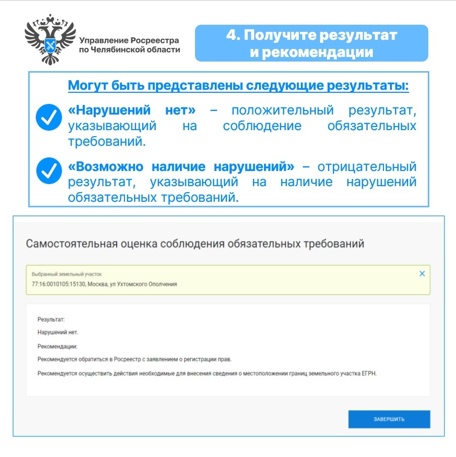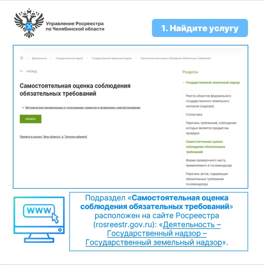 Управление Росреестра по Челябинской области сообщает, что на сайте Росреестра действует сервис, с помощью которого правообладатели земельных участков и землепользователи могут пройти самообследование и самостоятельно оценить соблюдение обязательных требований при использовании земельных участков. Как работает сервис – читайте в информационных карточках.