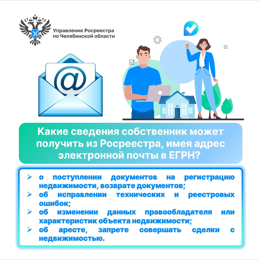 Почему собственнику недвижимости важно внести в Единый государственный реестр недвижимости актуальный адрес электронной почты и какие именно сведения о своём объекте он может оперативно узнать из сообщения на почту – читайте в информационных карточках Управления Росреестра по Челябинской области.