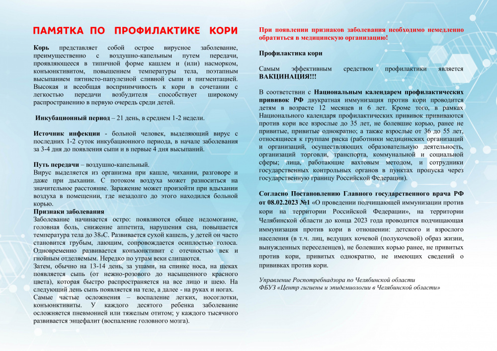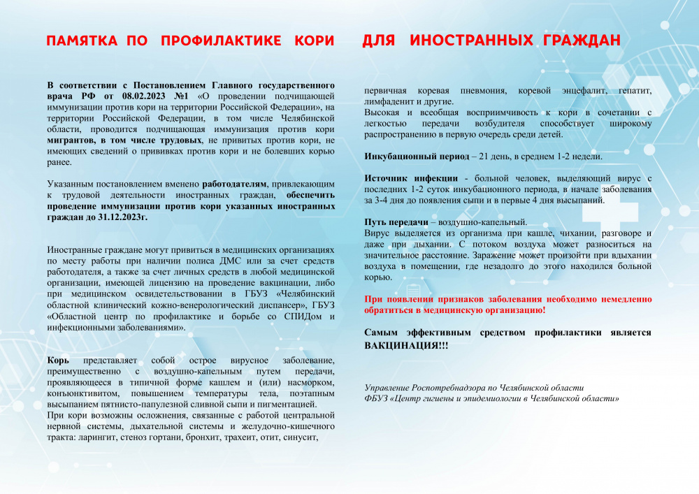 «Препараты для вакцинации в наших медучреждениях есть в достаточном количестве. Поэтому если к вам постучался в дверь медработник и сообщил, что в вашем доме или на работе есть заразившийся корью, нужно пройти вакцинацию. Так вы сможете избежать носительства и не будете представлять угрозы для окружающих, особенно для людей из групп риска, для которых корь крайне опасна», – прокомментировала Ирина Гехт, первый заместитель губернатора Челябинской области.