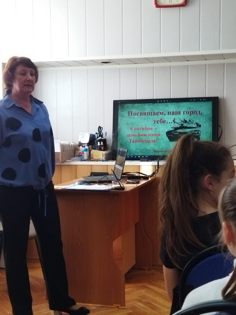 Во время беседы библиотекарь акцентировала внимание ребят, почему именно 6 октября отмечается День рождения Танкограда! Рассказала, что есть как минимум пять серьезных причин, по которым современники и потомки присвоили Челябинску славное и грозное имя ТАНКОГРАД. А именно, что за 33 дня был налажен производственный цикл выпуска средних танков «тридцатьчетверок» и тяжелых танков КВ вместо тракторов.