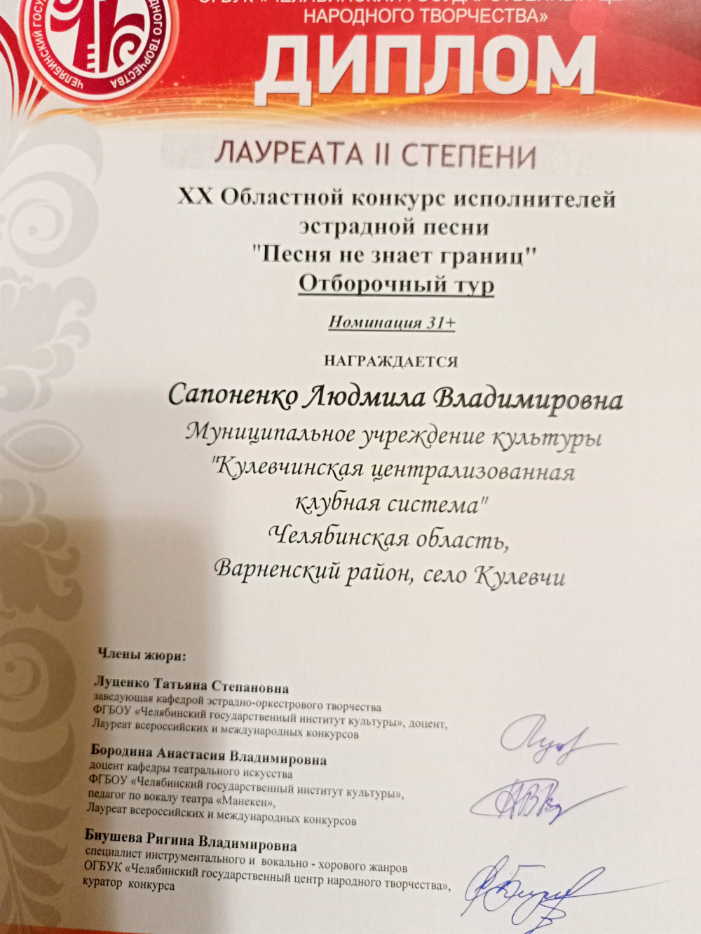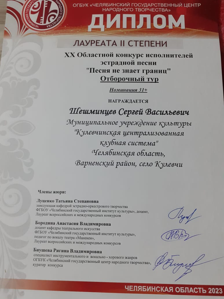 18 февраля в с. Чесма состоялся XX областной конкурс исполнителей эстрадной песни (отборочный тур) - «Песня не знает границ», в котором от Кулевчинского ДК приняли участие Шешминцев С.В. и Сапоненко Л.В.. По итогам конкурса они получили Дипломы Лауреата II степени.