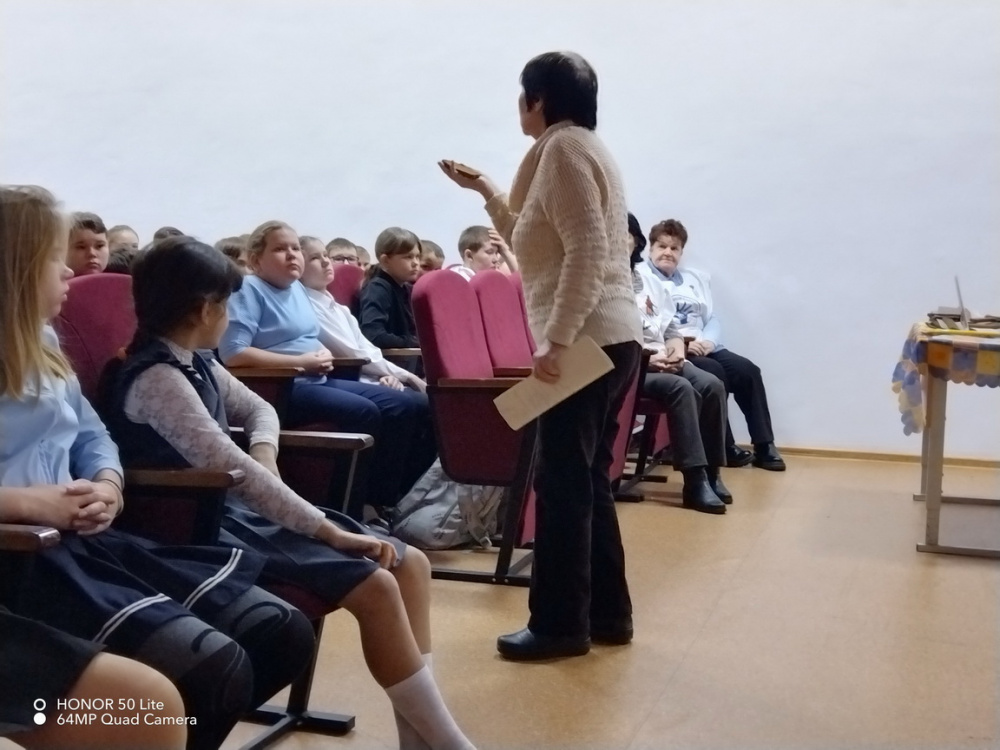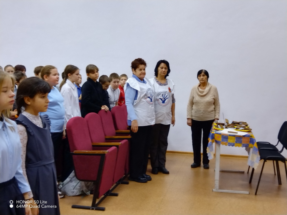 Ребята узнали, что в истории Великой Отечественной войны есть особые события, одним из которых является блокада Ленинграда, вписанная в историю 900000 погибшими от холода, голода, артобстрелов ленинградцами, но ни голод, ни холод, ни артиллерийские обстрелы не сломили духа его защитников. Серебряный волонтер, бывший учитель истории Минслу Шакировна Ишкаева рассказала ученикам о героическом прошлом нашего народа, о нелегкой судьбе героических защитников и жителей осажденного города, о блокадном хлебе, который для ленинградцев стал символом жизни. Серебряные волонтеры Селиверстова Альфия Шагшарифовна и Карпова Галина Михайловна раздали детям дневной паёк жителя блокадного города – сто двадцать пять граммов хлеба, который выдавали по карточкам, Взрослые рассказали детям о важности этого листочка картона, по которому ленинградцы получали хлеб и который берегли, ведь при утере карточка не возобновлялась. Детям показали видеофрагмент с видами современного Санкт-Петербурга и фотографиями освобожденного в 1944 году города. Жители города сделали всё, чтобы восстановить величественный вид одного из прекраснейших городов мира, за который сражались и умирали в годы блокады.