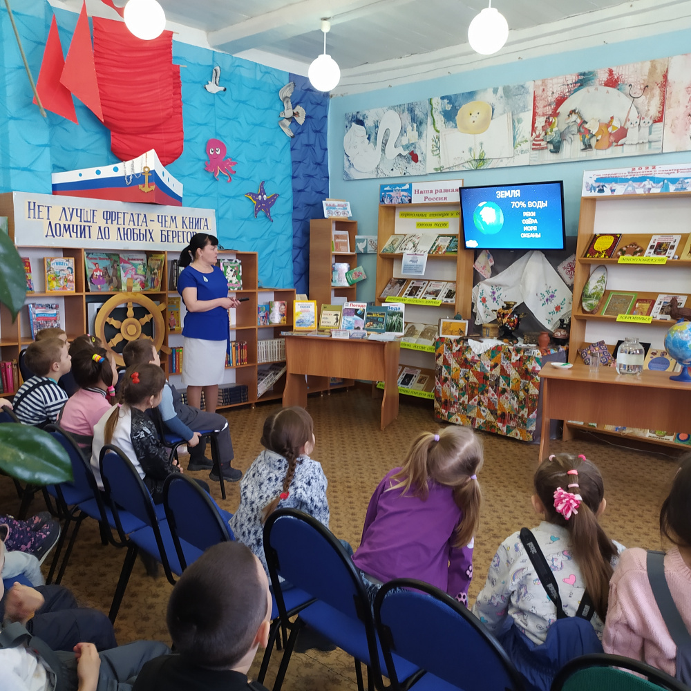 Со столь важной темой дети познакомились в игровой форме, вначале дети познакомились с героем мультфильма Капитошкой – веселой, озорной капелькой,; узнали, что такое круговорот воды, откуда появляются капельки в облачке и как они спускаются к нам обратно. Библиотекарь на примере показала соотношение морской (банка) и пресной (реки-стакан),(озера-капельки на блюдце) воды. На данном примере дети убедились, что запасов пресной воды очень мало и хотя капелька воды постоянно путешествует по кругу (круговорот воды в природе) снова возвращаясь в водоемы, тем не менее, воду нужно беречь(не засорять водоемы, не забывать закрывать кран с водой и др.).