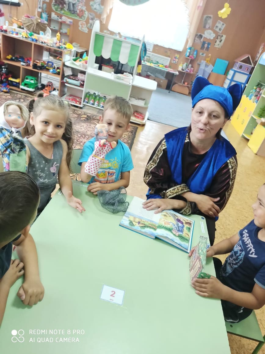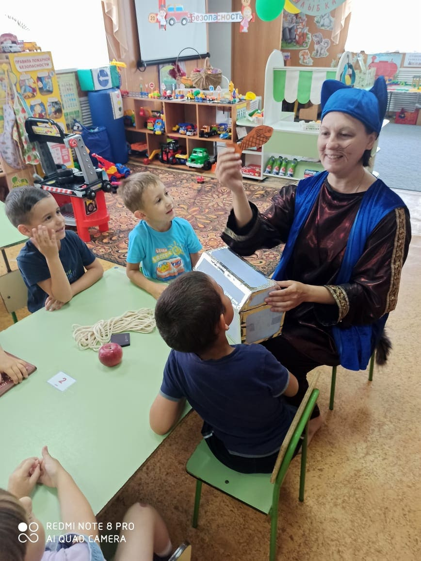 Главный персонаж этой встречи – Кот Ученый. Он подготовил задания для детей, а предметы из волшебного ларца помогли вспомнить детям главных героев из сказок Пушкина, и ответить на вопросы викторины. Дети с удовольствием приняли участие в театральной постановке отрывка из сказки «Сказка о рыбаке и рыбке». Поиграли с Котом в игру «Невод».