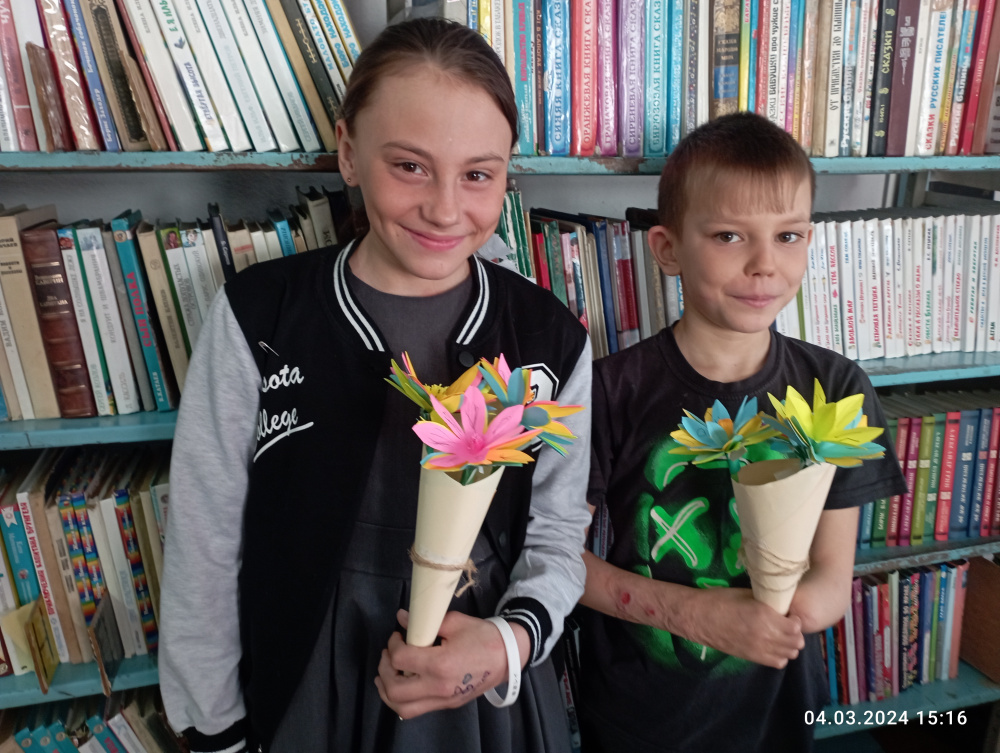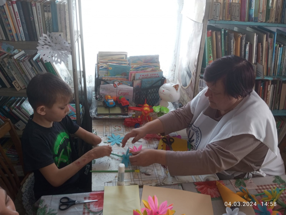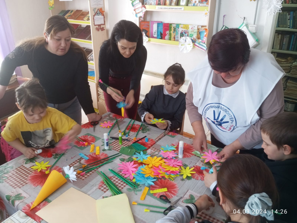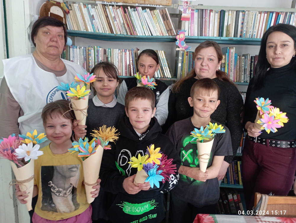 Ребят встретили работник библиотеки Любовь Александровна Денисова и серебряный волонтер Елена Николаевна Чернега. Социальный педагог МУ «КЦСОН» рассказала ребятам об истории происхождения праздника, о роли женщины в обществе, напомнила о необходимости проявлять  уважение к женщинам, задавала тематические вопросы, на которые дети с удовольствием отвечали.