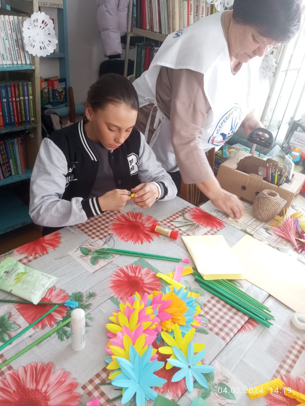 Продолжила занятие серебряный волонтер Елена Николаевна Чернега. Ребята с удовольствием сделали поделки в подарок для родных и близких женщин. Елена Николаевна не впервые проводит мастер-классы для ребят с. Толсты, всегда находит время для встреч и общения с детьми, которые тоже с нетерпением ждут возможности с ней встретится. По окончании мероприятия социальный педагог вручила всем участникам мероприятия сладкие угощения и вместе с ребятами  выразила благодарность  Елене Николаевне и Любовь Александровне за их мастерство и душевную щедрость.