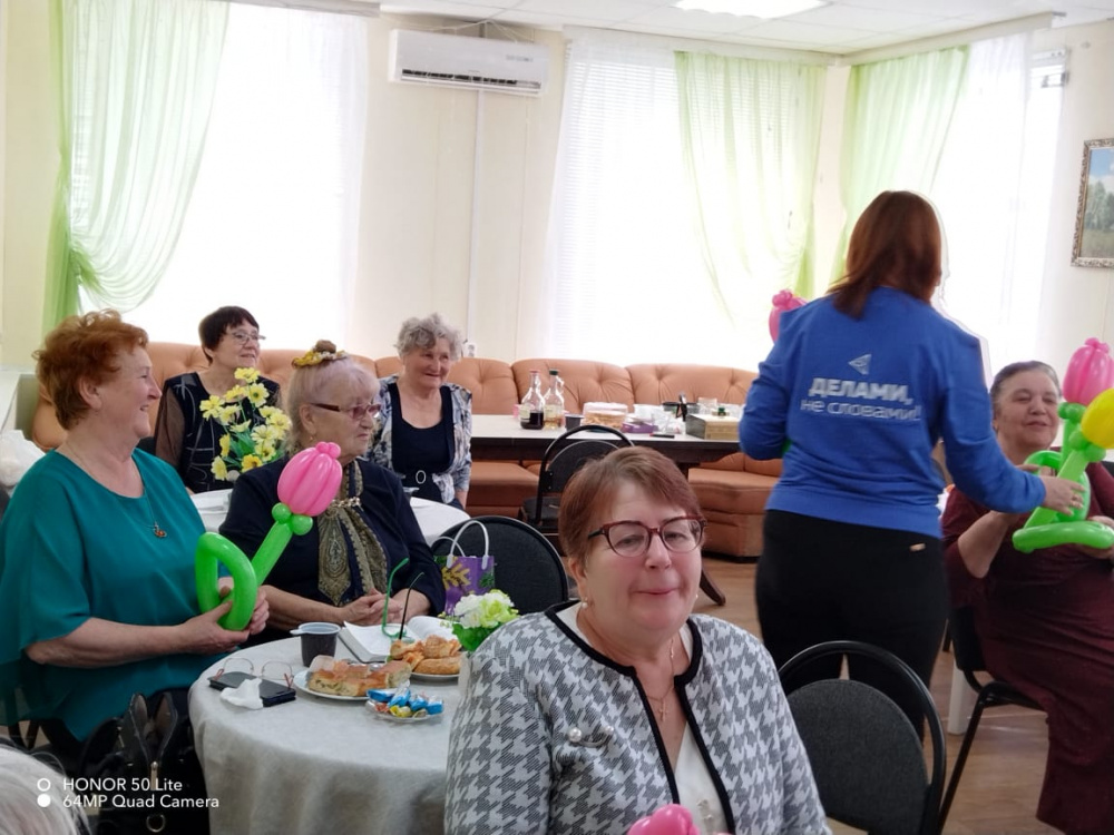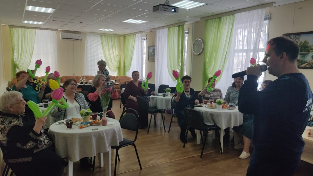 Всех гостей клуба в этот день с международным женским днем пришли поздравить волонтеры Русской медной компании. Они подарили женщинам цветы и песни.