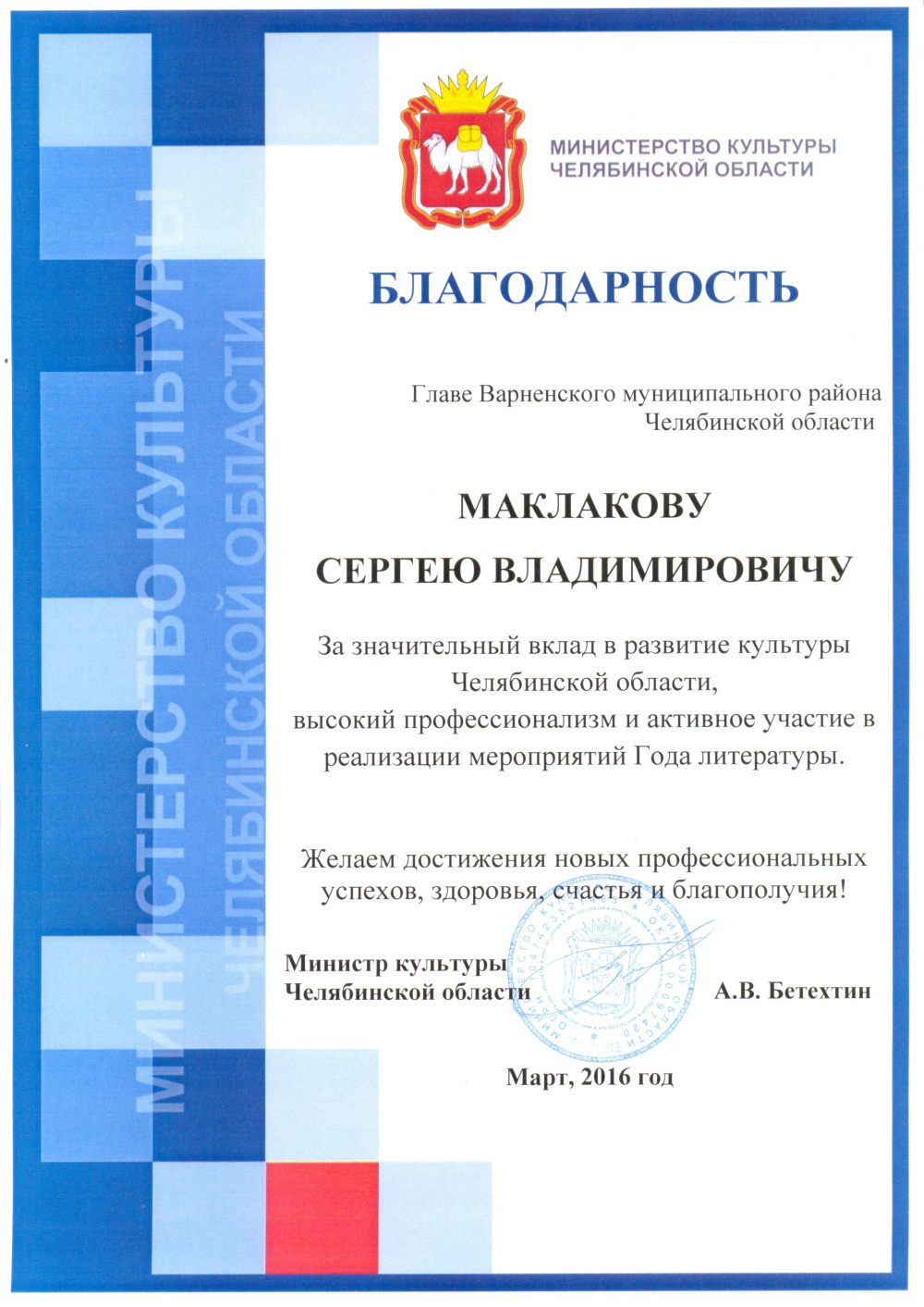 За значительный вклад в развитие культуры Челябинской области, высокий профессионализм и активное участие в реализации мероприятий Года литературы Маклаков Сергей Владимирович был отмечен благодарностью министерства культуры Челябинской области.