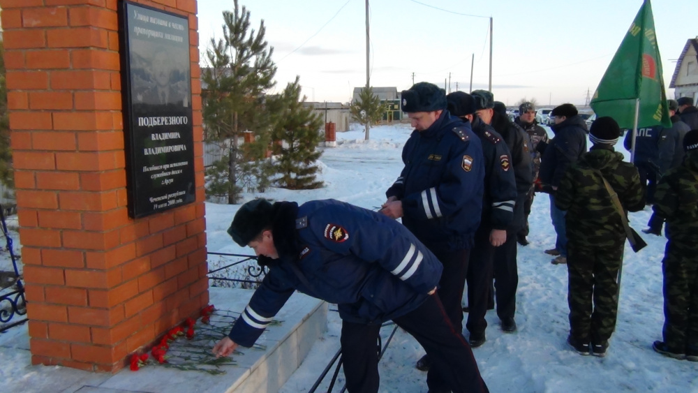 У мемориальной доски, памяти В.В. Подберезного прошёл митинг, посвящённый Дню Героев Отечества и 21 годовщине ввода войск в Чеченскую Республику