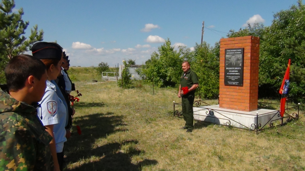Торжественное построение руководства, личного состава отдела полиции, ветеранов и членов Общественного совета, ветеранов боевых действий, членов «Боевого братства» состоялось у мемориальной доски, памяти прапорщика милиции Владимира Подберезного, погибшего 19.07.2000 года при исполнении служебного долга в результате обстрела в г. Аргун Чеченской Республики.