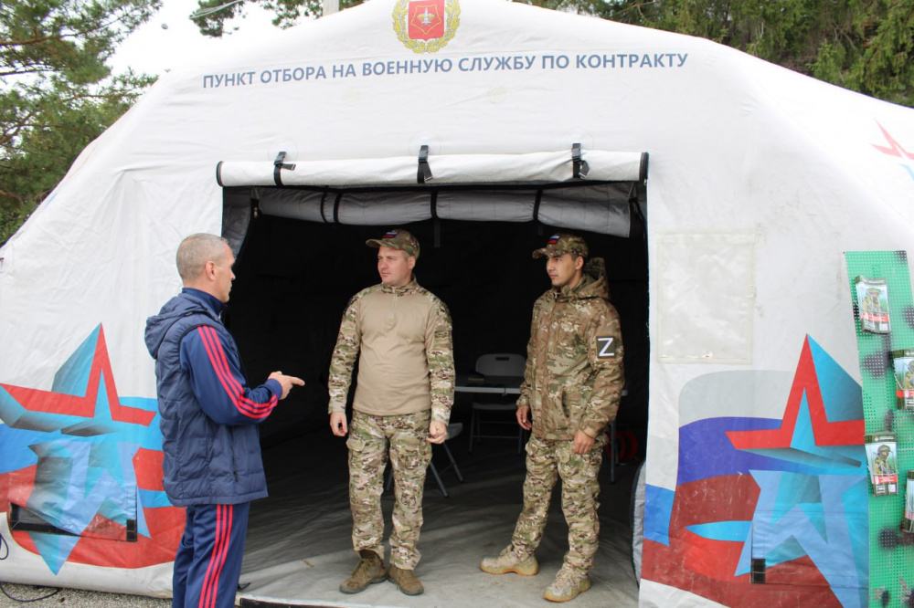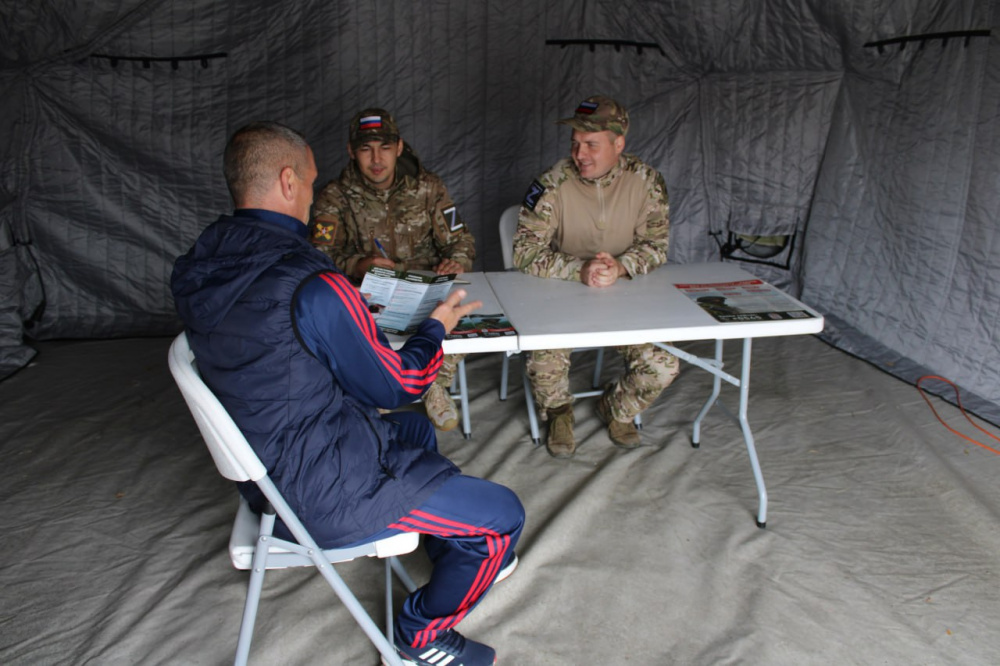 В пункте отбора работают инструкторы из числа участников специальной военной операции. В палатке демонстрируется военное оружие, амуниция, средства защиты.