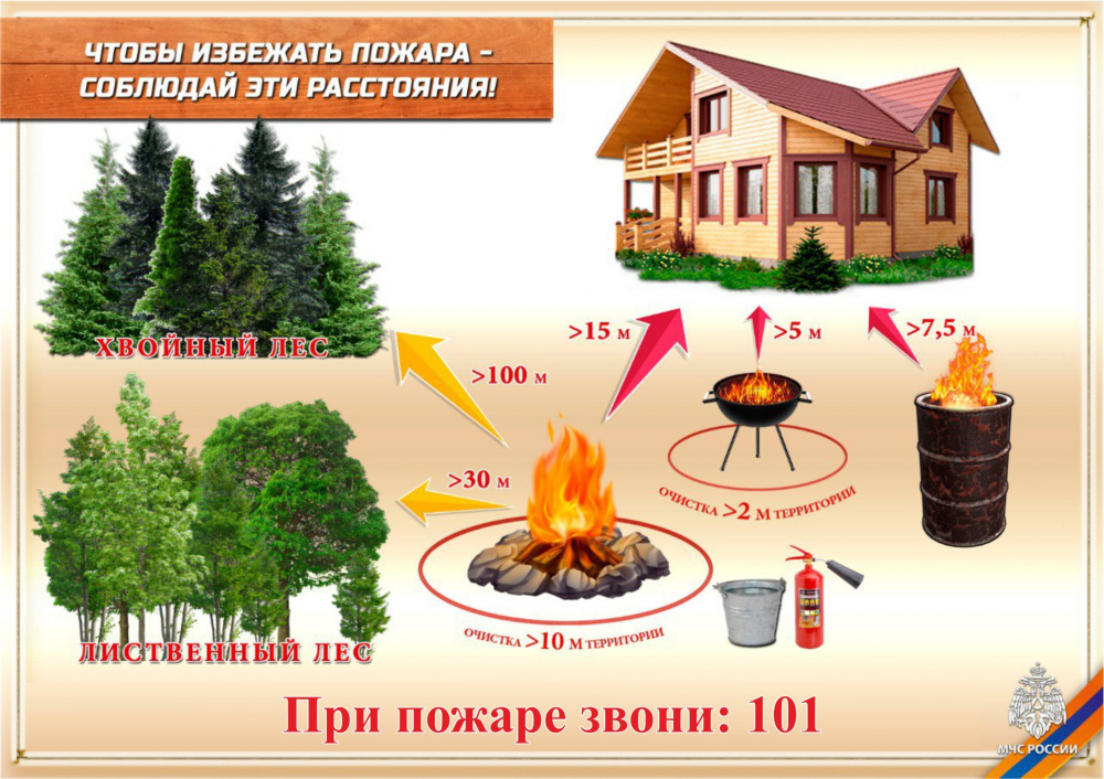 - разведение костров и сжигание мусора на территории домовладений разрешено на очищенной от сухой травы (до земляного слоя) площадке радиусом 10 метров, окопав ее по принципу противопожарной минерализованной полосы шириной не менее 0,4 метра, на расстоянии не менее 15 метров от строений, 30 метров от лиственных лесов, 100 метров – от хвойных;