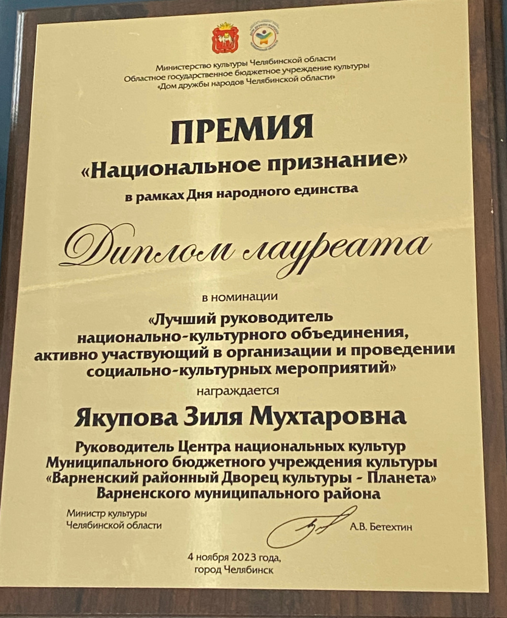 4 ноября 2023 года в Челябинске в концертном зале им. С.С. Прокофьева состоялось награждение победителей областного фестиваля национальных культур «Соцветие дружное Урала» премией «Национальное признание».