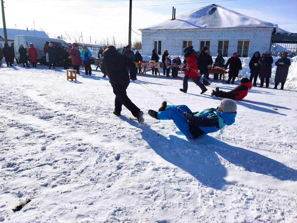 Уличная площадь Дома культуры превратилась в большую игровую площадку, с катанием жителей на лошади в санях и снегоходе с повозкой под весёлую задорную музыку.