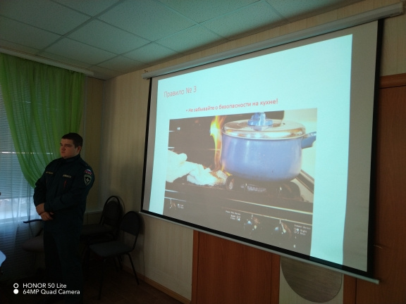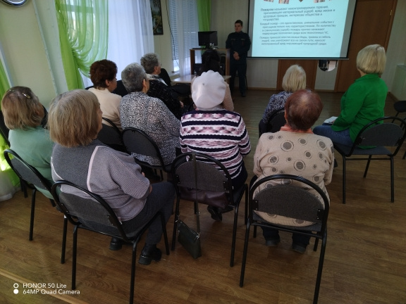 В ходе выступления Егор Андреевич осветил вопросы пожарной безопасности людей старшего поколения, напомнил номера телефонов экстренных служб, рассказал об алгоритме действий при пожаре, а также о недопустимости ложных вызовов.