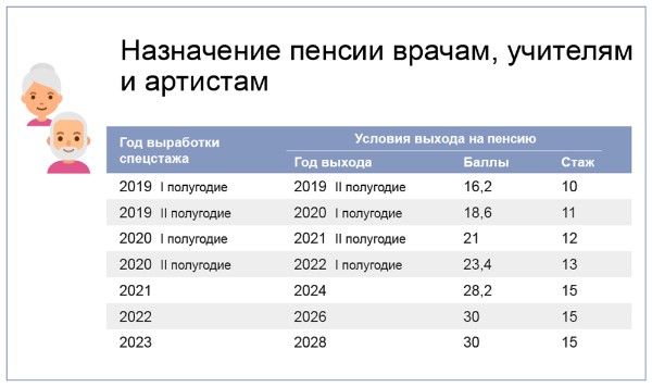 Льготный выход на пенсию также сохраняется у педагогов, врачей и представителей других профессий, которым выплаты назначаются не по достижении пенсионного возраста, а после приобретения необходимой̆ выслуги лет. При этом с 2019 года назначение пенсии в таких случаях происходит с учётом переходного периода по повышению пенсионного возраста, который вступает в силу с момента приобретения необходимой̆ выслуги лет по профессии. Например, школьный учитель, выработавший в апреле 2019-го необходимый педагогический стаж, сможет выйти на пенсию в соответствии с переходным периодом через шесть месяцев, в октябре 2019-го.