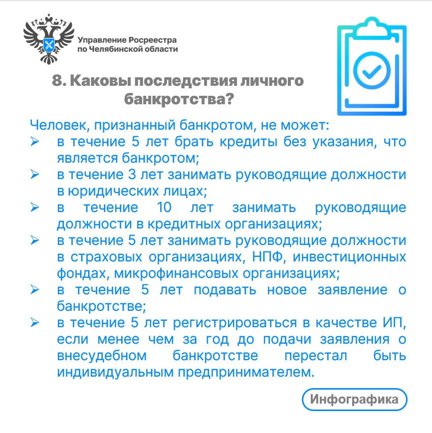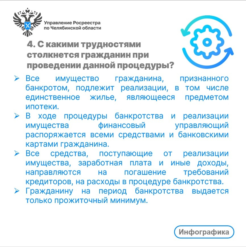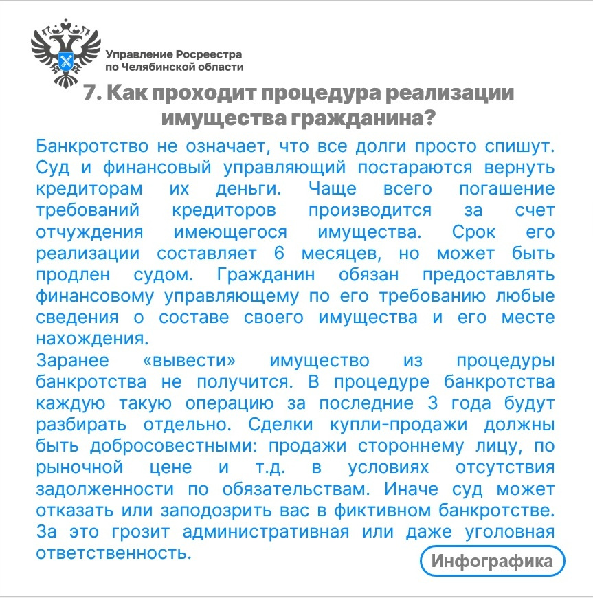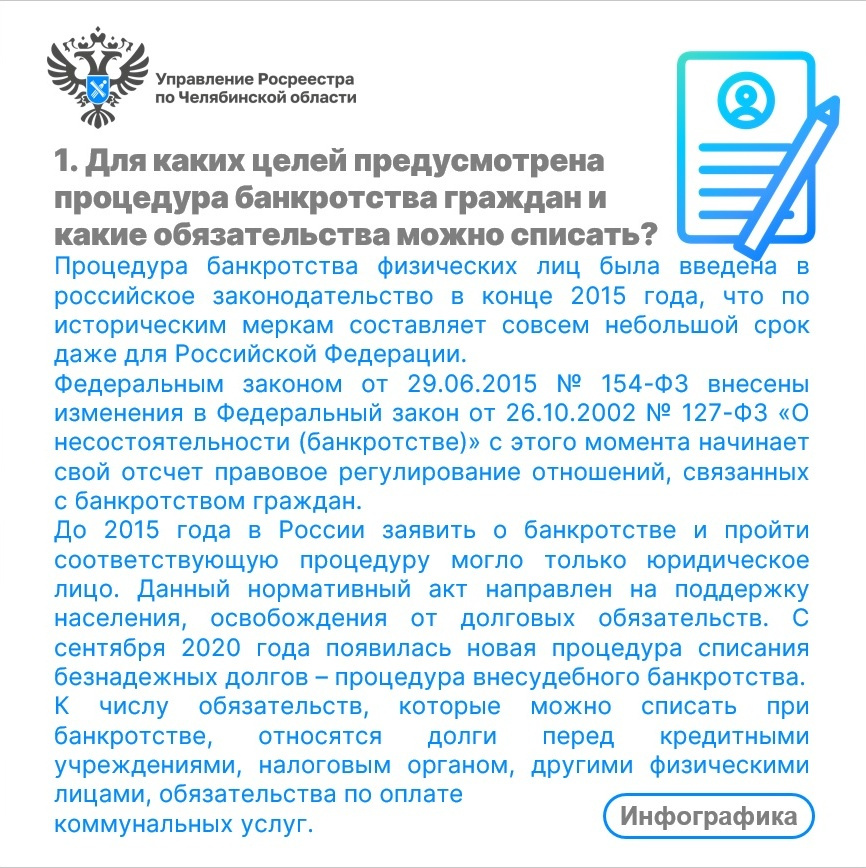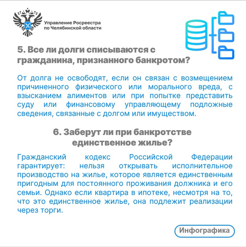 Банкротство – актуальная тема для многих южноуральцев. Разобраться в важных аспектах законодательства о банкротстве помогут информационные карточки Управления Росреестра по Челябинской области.