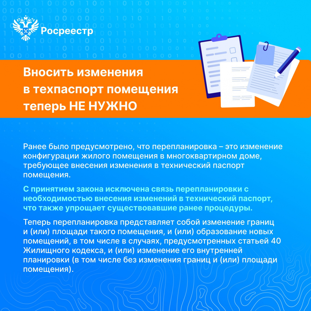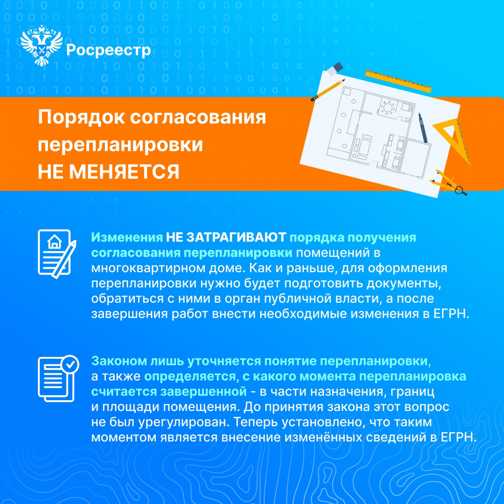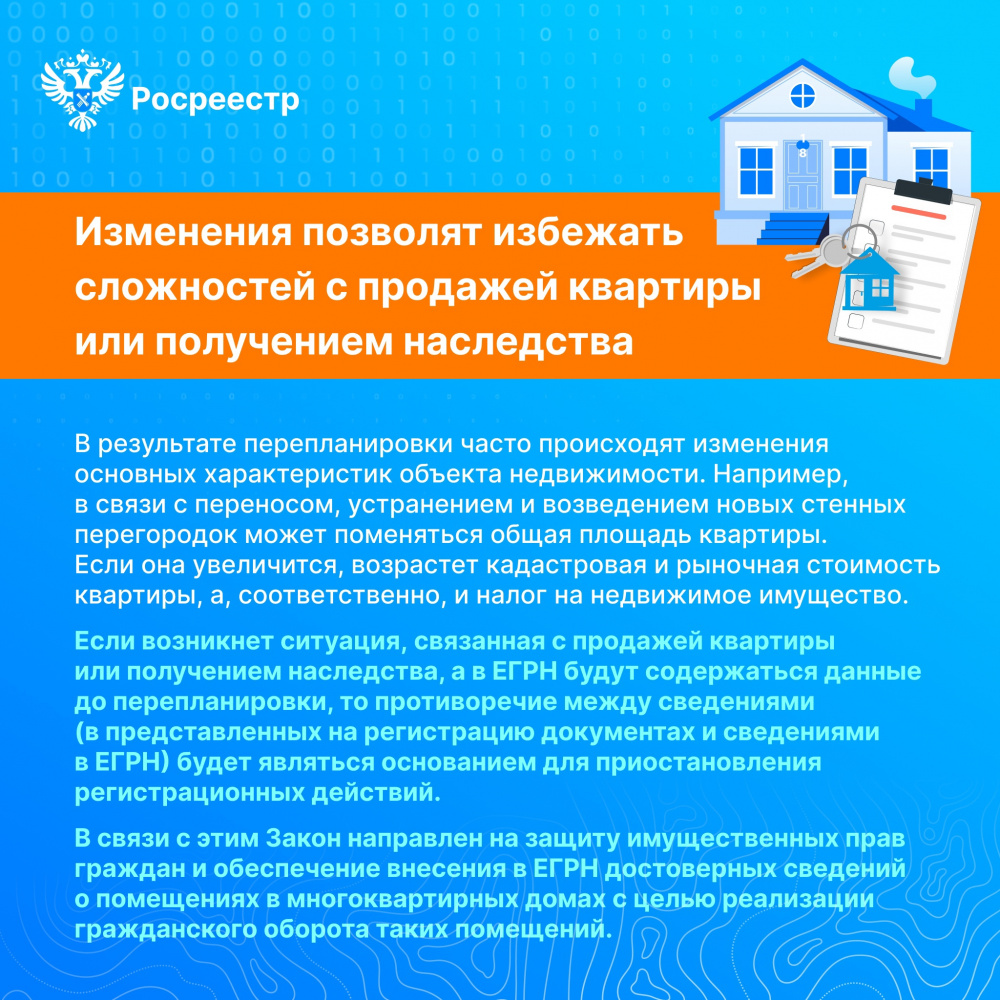 1 апреля 2024 вступают в силу изменения, внесенные в Жилищный кодекс РФ и Федеральный закон от 13.07.2015 № 218-ФЗ «О государственной регистрации недвижимости». Они уточняют понятие перепланировки, момент ее окончания, а также более детально регулируют взаимодействие между органами местного самоуправления, которые приняли решение о перепланировке или переводе из жилого помещения в нежилое и наоборот, с органами регистрации прав по обмену сведениями и документами для внесения в ЕГРН информации о перепланировке и переводе помещений.