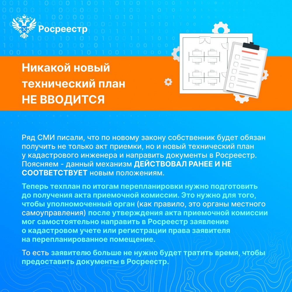 Сведения о перепланировке помещений вносятся в ЕГРН только при наличии акта приемочной комиссии или решения суда, технического плана.