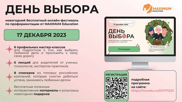 Информируем вас о проведении и возможности принять участие учащимся 5–11 классов и их родителям в бесплатном фестивале по профориентации «День Выбора», который пройдет в онлайн-формате 17 декабря 2023 года.