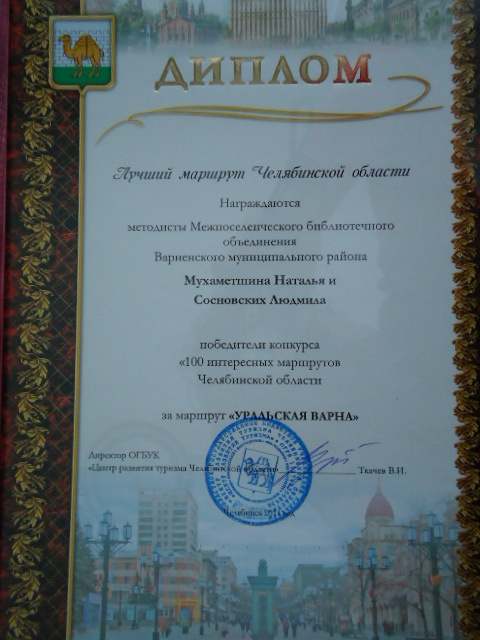 Методисты «Межпоселенческого библиотечного объединения Варненского муниципального района» представили на конкурс методическую разработку туристического маршрута «Уральская Варна». Они стали призёрами конкурса, вошли в десятку лучших маршрутов и были награждены дипломом победителей и ценным подарком.