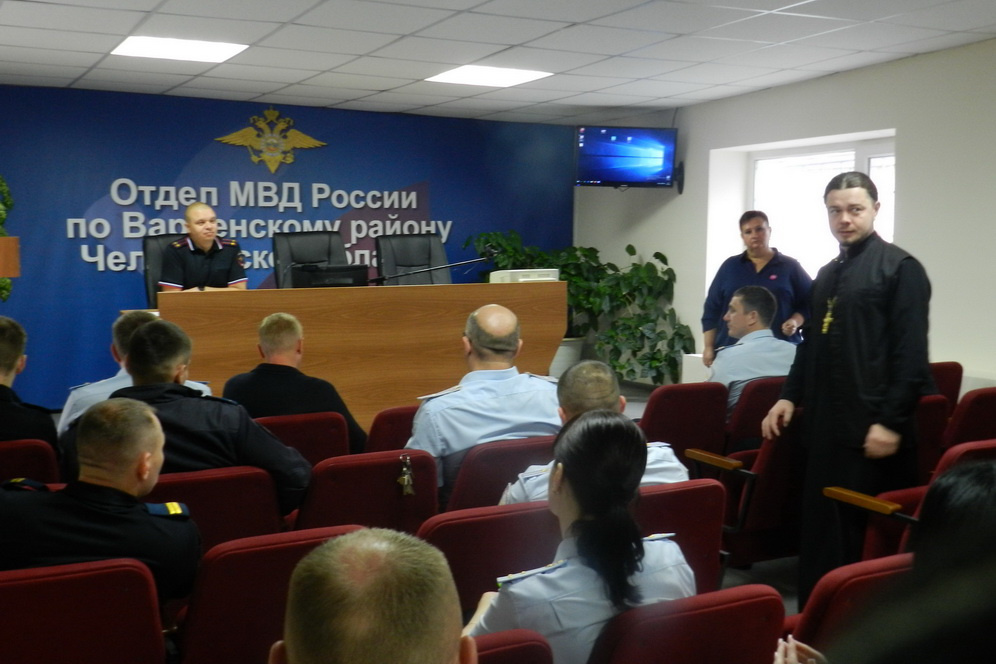 По инициативе Общественного совета ОМВД России по Варненскому району председатель Александра Акиньшина и представители Совета - иерей Степан Андрейко, настоятель храма Рождества Пресвятой Богородицы, Мариям Дементьева, преподаватель школы № 1 села Варна, ветеран МВД Алексей Коннов посетили ОМВД России по Варненскому району. На занятиях по служебной подготовке встретились с личным составом.