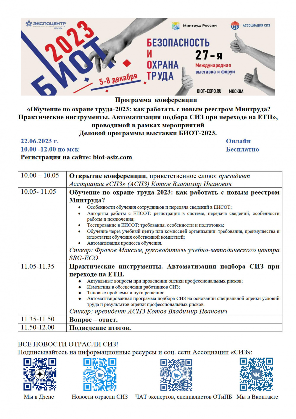 Ассоциация разработчиков, изготовителей и поставщиков средств индивидуальной защиты (Ассоциация «СИЗ») в рамках экосистемы БИОТ при поддержке Минтруда России 22 июня 2023 года в 10.00 (время московское) проводит бесплатную онлайн-конференцию для работодателей, руководителей и специалистов служб охраны труда и промышленной безопасности на тему: «Обучение по охране труда – 2023: как работать с новым реестром Минтруда? Практические инструменты. Автоматизация подбора СИЗ при переходе на ЕТН».
