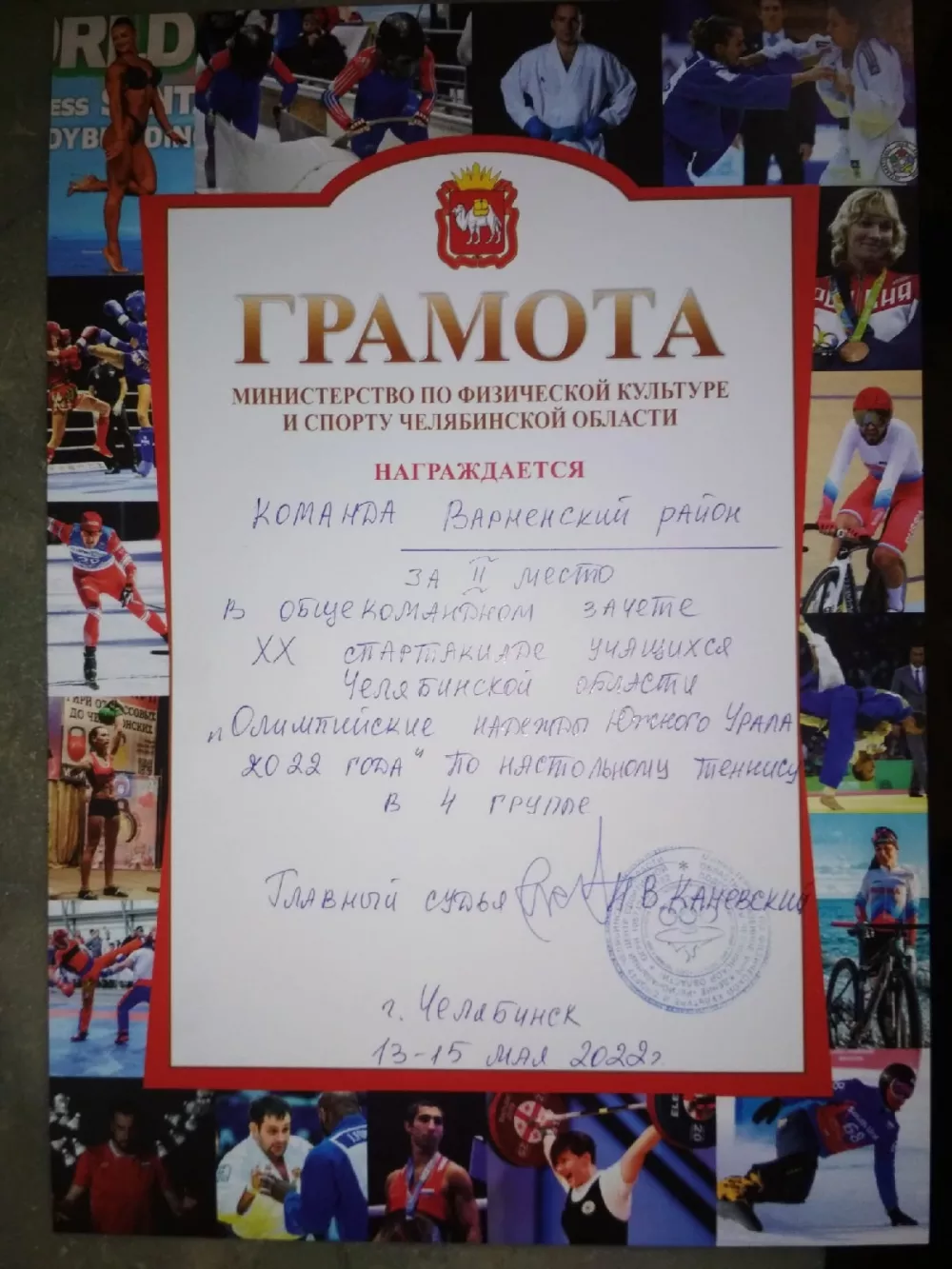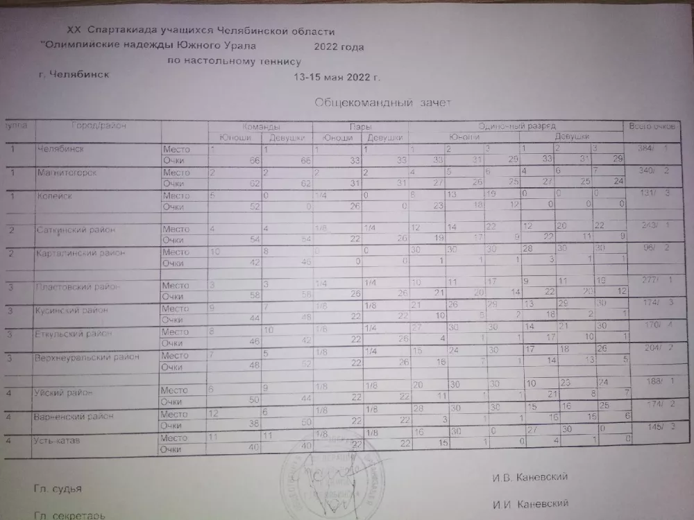 С 13 по 15 мая в городе Челябинск на базе спортивной школы «Юпитер» (ДК «Восток, Металлургический район) проходила ХХ Спартакиада учащихся Челябинской области по настольному теннису «Олимпийские надежды Южного Урала 2022 года». В соревнованиях участвовало 12 сборных команд из г. Челябинск, г. Магнитогорск, г. Копейск, г. Усть-Катав, Саткинский, Карталинский, Пластовский, Кусинский, Еткульский, Верхнеуральский, Уйский и Варненский районы.