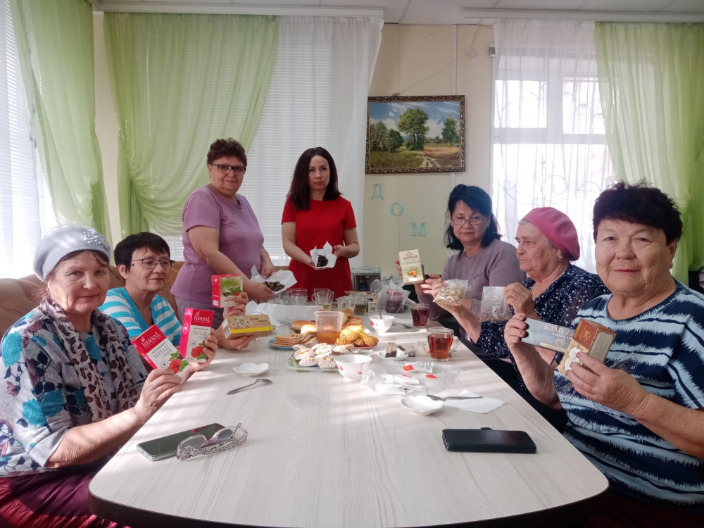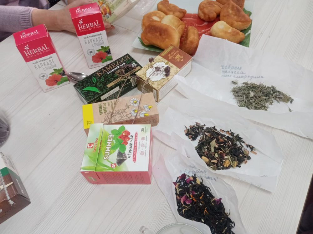 По возвращении в досуговый центр  участники клуба  согревались ароматным  травяным чаем в фитобаре и вели душевные беседы за столом. Виды чая на нашем столе разнообразны. Здесь и ромашка, цветы липы, душица, мята, земляника, лепестки роз и многое другое. Аромат от заваренных трав витал в воздухе всего комплексного центра.