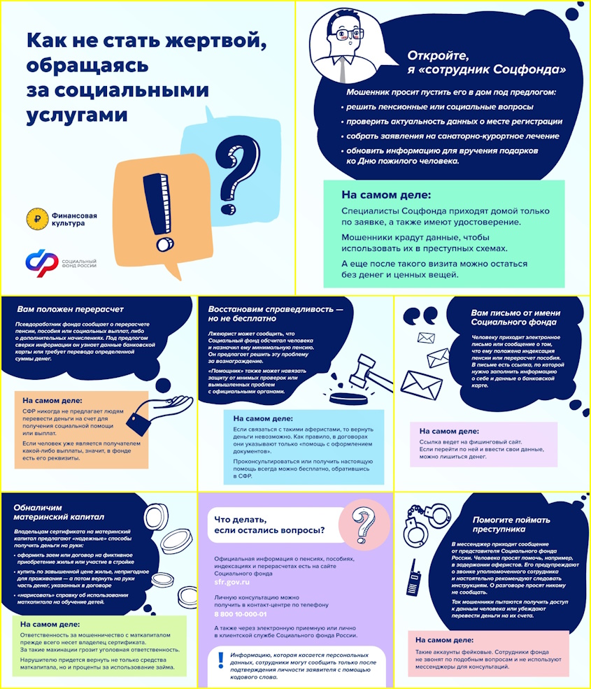 С какими услугами обещают помочь мошенники, что произойдет, если им поверить, и куда обратиться за настоящей помощью? Финансовая культура и Социальный фонд рассказали об этом в карточках.