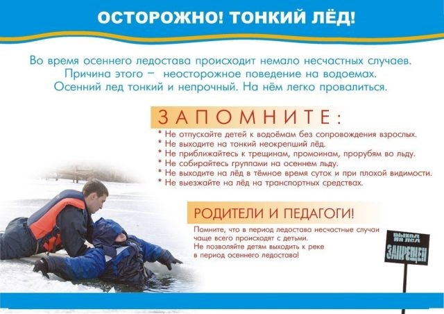 Запрещается выходить на лёд в состоянии алкогольного опьянения, прыгать и бегать по льду, собираться большим количеством людей в одной точке, выходить на тонкий лёд, который образовался на реках с быстрым течением.
