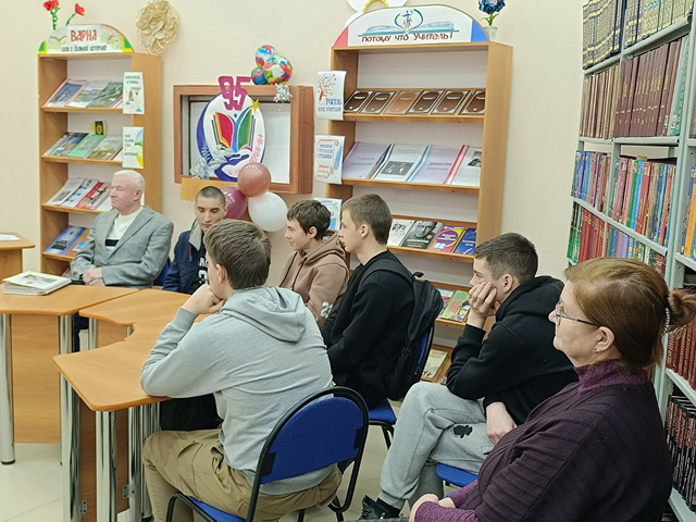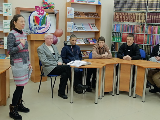 В Варненской центральной библиотеке на мероприятии посвященную 90-летнему юбилею "От уезда до области" побывали учащиеся Варненского КМТ, группа 18 МО (руководитель производственного обучения Катрюк Алексей Иванович). Для молодежи была подготовлена презентация "От уезда до области" с интересными фактами о Челябинской области, предоставлена история образования области, книжная выставка. Почетный гость нашего мероприятия Артемьев Виктор Иванович рассказал молодым ребятам о деятелях челябинской области и дал напутствие быть здоровыми и активными.