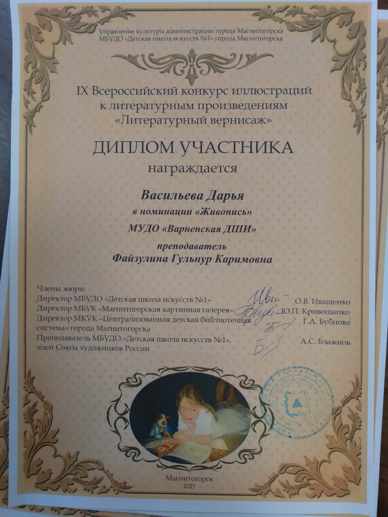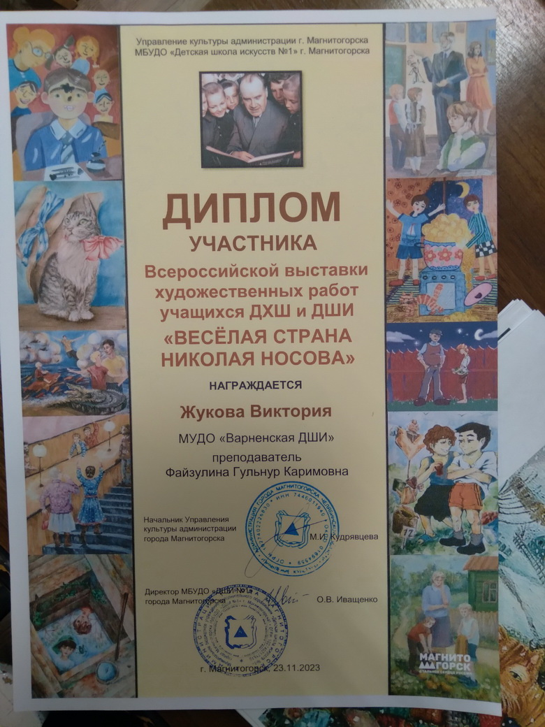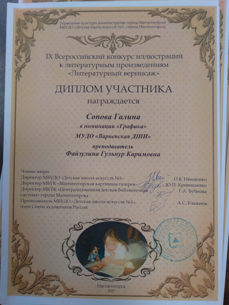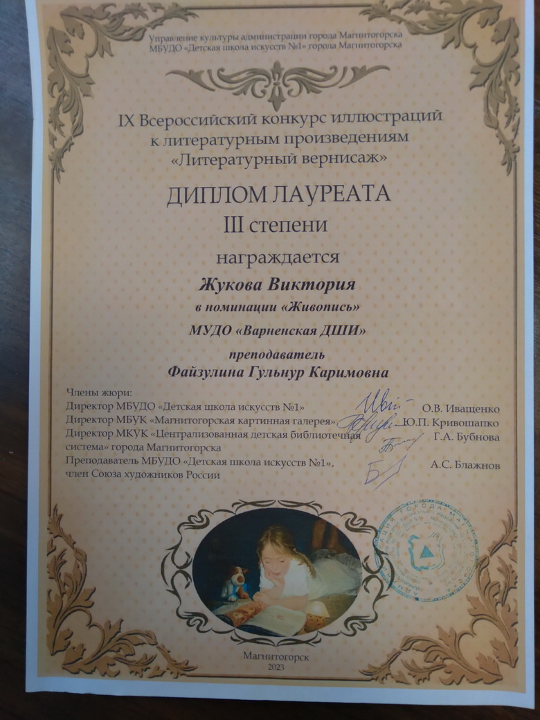 23 ноября 2023 года в ДШИ №1, г. Магнитогорска состоялось открытие Всероссийской выставки призеров по итогам конкурса «Литературный вернисаж». Ученица Жукова Виктория стала Лауреатом III степени, её рисунок был размещён на выставке в ДШИ №1 г.Магнитогорска.