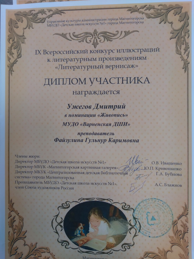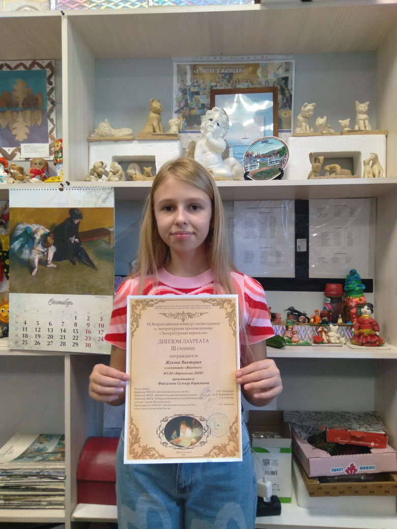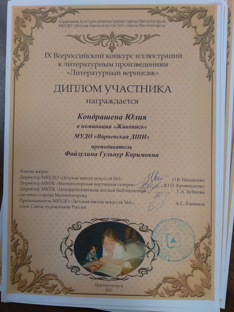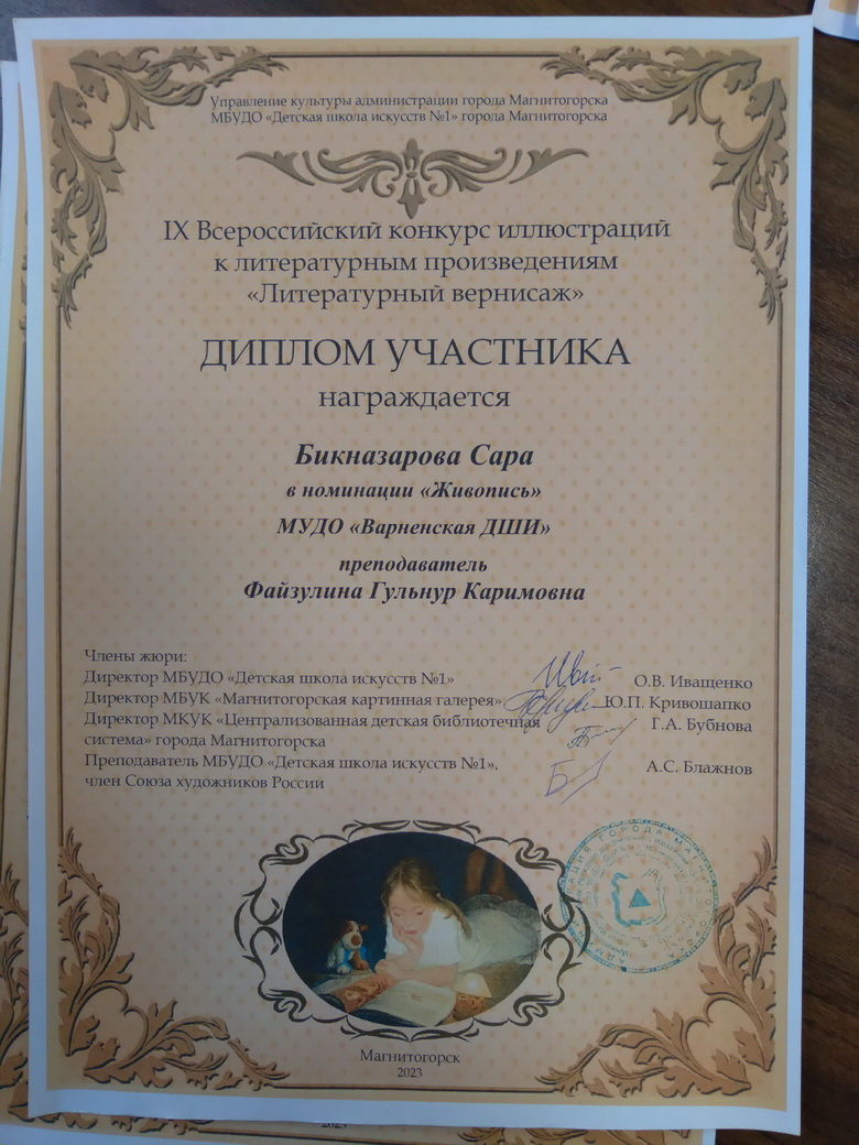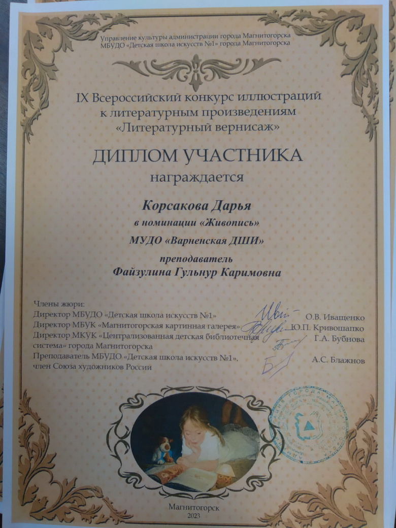 23 ноября 2023 года в ДШИ №1, г. Магнитогорска состоялось открытие Всероссийской выставки призеров по итогам конкурса «Литературный вернисаж». Ученица Жукова Виктория стала Лауреатом III степени, её рисунок был размещён на выставке в ДШИ №1 г.Магнитогорска.