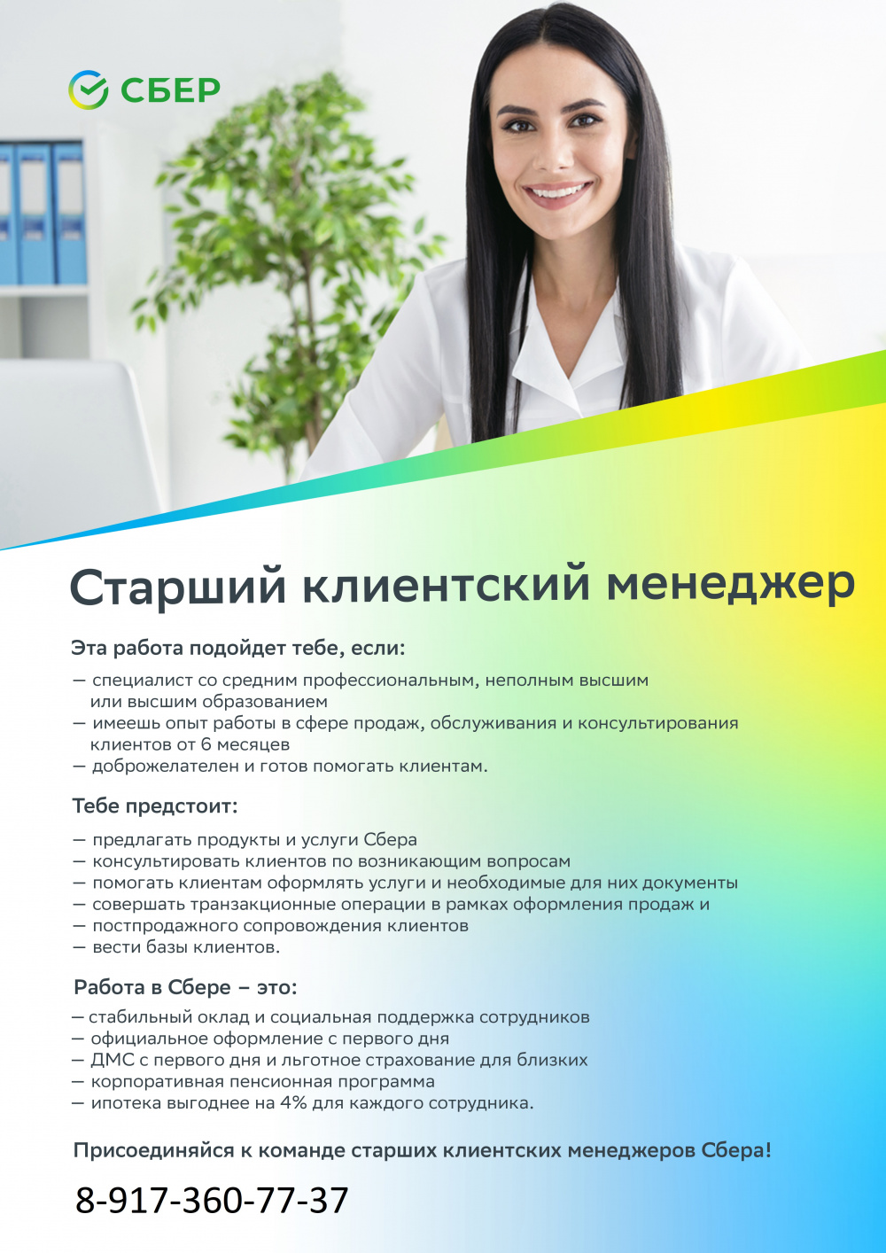 Основные задачи: продажа продуктов и услуг экосистемы Сбера, помощь и консультация клиентов при оформлении услуг.