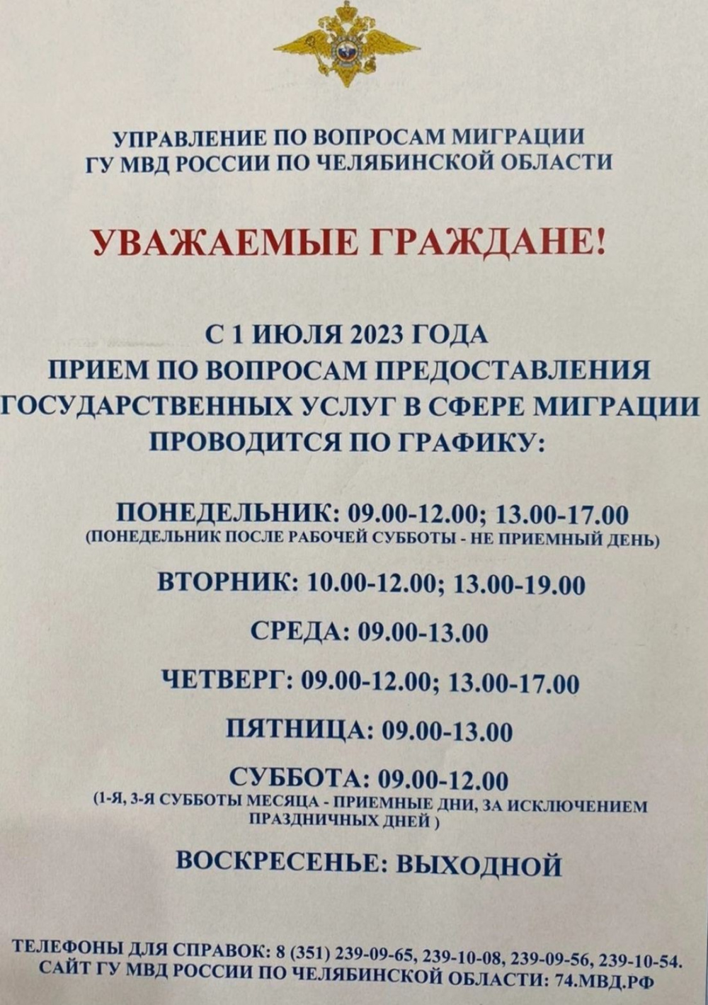 С 1 июля 2023 года в подразделениях по вопросам миграции территориальных органов МВД России Челябинской области прием граждан по вопросам предоставления государственных услуг в сфере миграции будет проводиться по следующему графику: