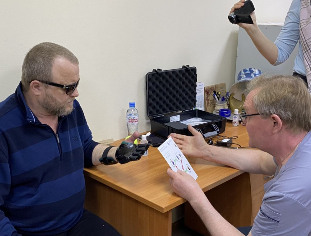С интересом и настойчивостью Юрий Сайко изучает функциональность протеза: сгибает и разгибает пальцы в разных положениях кисти, переключает cхваты, пробует взять теннисный мячик и бутылку с водой.