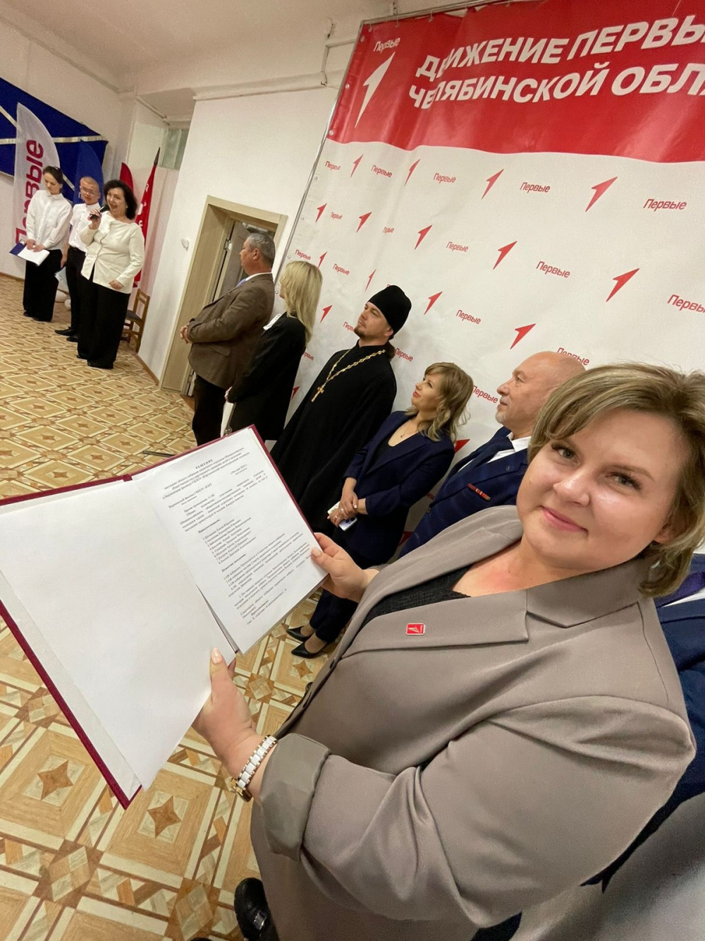 Шумских Елена Юрьевна, исполняющая обязанности руководителя филиала, в торжественной обстановке, вручила пакет документов о принятом решения вступить в ряды Движения председателю местного отделения Движения Первых Гайрфановой Елене Айратовне.