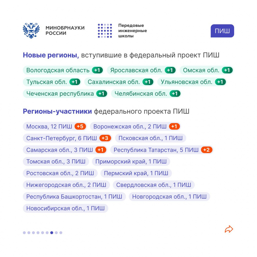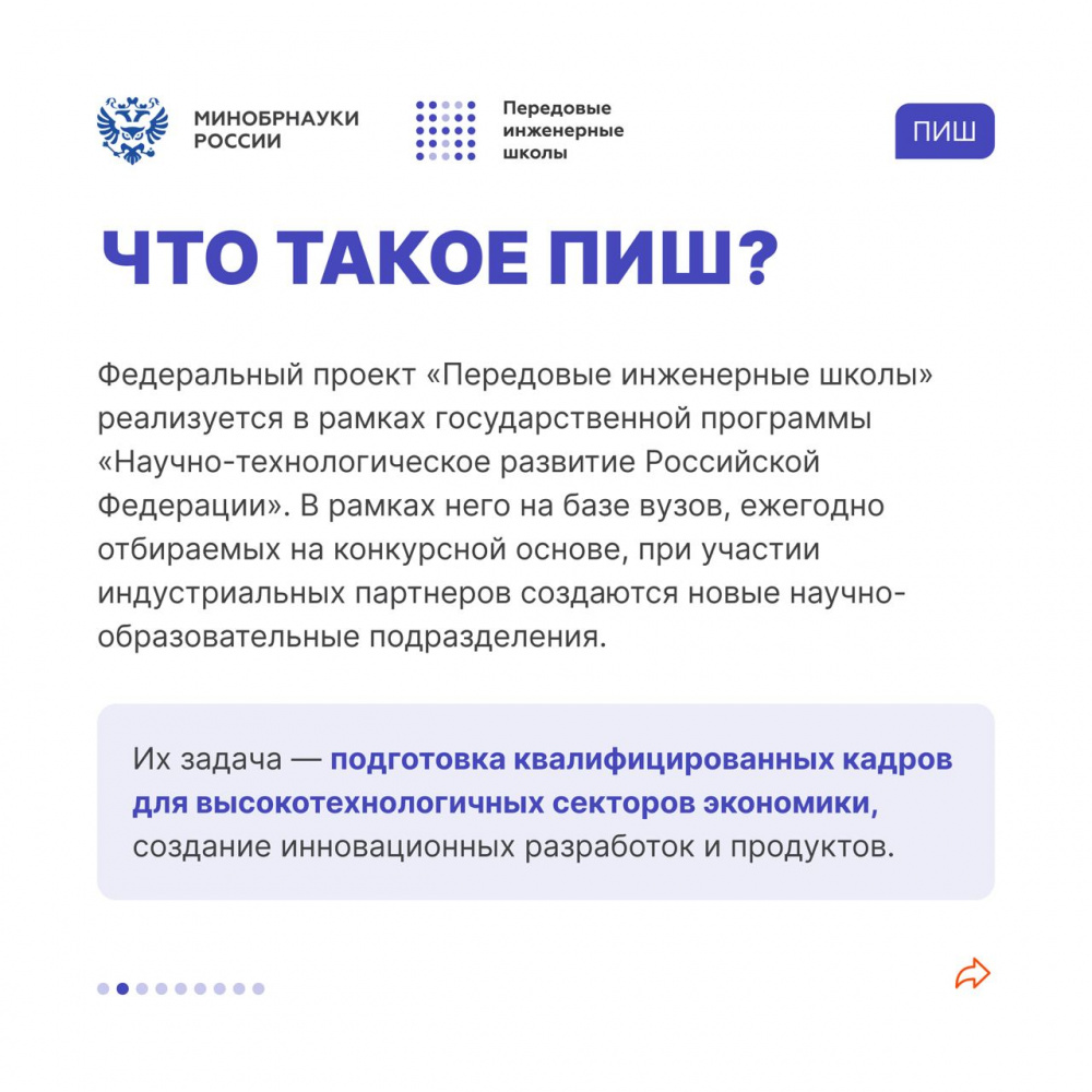 «Передовые инженерные школы» – федеральный проект, созданный на основе одной из 42 стратегических инициатив социально-экономического развития, которые утвердил Председатель Правительства Михаил Мишустин. В 2022 году по итогам конкурсного отбора победителями проекта стали 30 университетов из 15 субъектов Российской Федерации. По итогам второй волны отбора в 2023 году число передовых инженерных школ увеличится до 50, причем в 8 регионах они будут созданы впервые.