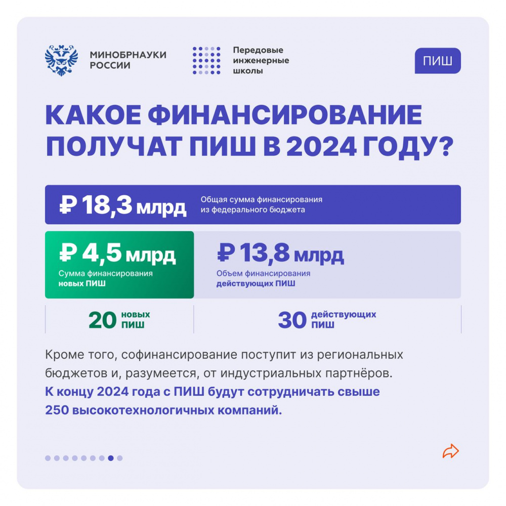 В 2024 году из федерального бюджета вузам-участникам проекта будет доведено более 18,3 млрд рублей, из которых почти 4,5 млрд рублей получат новые передовые инженерные школы.