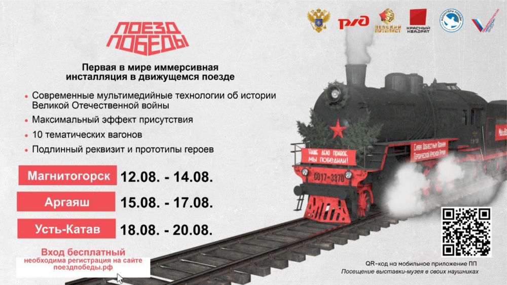 Первой остановкой станет город Магнитогорск – туда поезд прибудет 12 августа и сможет принять посетителей в течение трех дней вплоть до 14 августа. С 15 по 17 августа «Поезд Победы» будет находиться в Аргаяше. Затем уникальный состав отправится в Усть-Катав и простоит там с 18 по 20 августа. Выставка-музей разместится на железнодорожных вокзалах, где будет организовано посещение экспозиции.