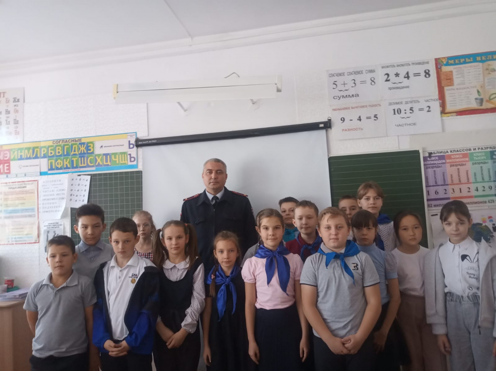 В целях повышения уровня правовой грамотности учащихся, информированности о том, что такое «можно», а что такое «нельзя» в школе и дома, профилактики распространения среди детей и молодёжи культуры насилия и формирования коммуникативных умений школьников был приглашён начальник ОУУП и ПДН ОМВД России по Варненскому району Наиль Ильясович Хасанов. Гость в погонах также обратил внимание ребят на то, что полицейским можно и нужно доверять, на них можно положиться в трудной ситуации.