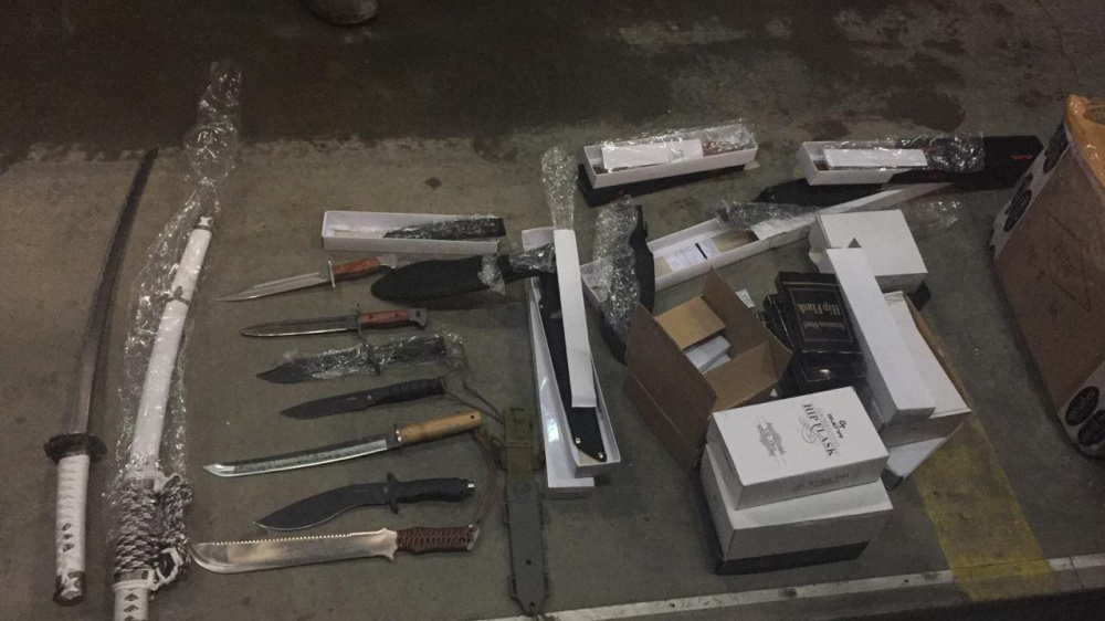 19 единиц штык-ножей, японских мечей, мачете и армейских ножей, конструктивно схожих с холодным оружием, были выявлены в автомобильном пункте пропуска «Бугристое» в сборном грузе почтовых отправлений в результате досмотра грузового транспортного средства, следовавшего на выезд из Российской Федерации по маршруту г. Москва - г. Нур-Султан (Республика Казахстан). Все предметы пытались переместить через границу без надлежаще оформленных сопроводительных документов.