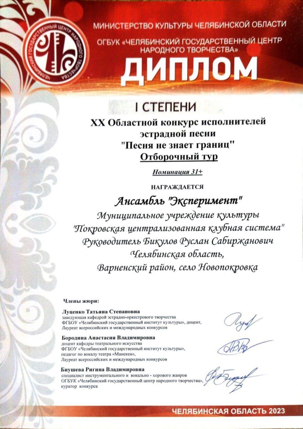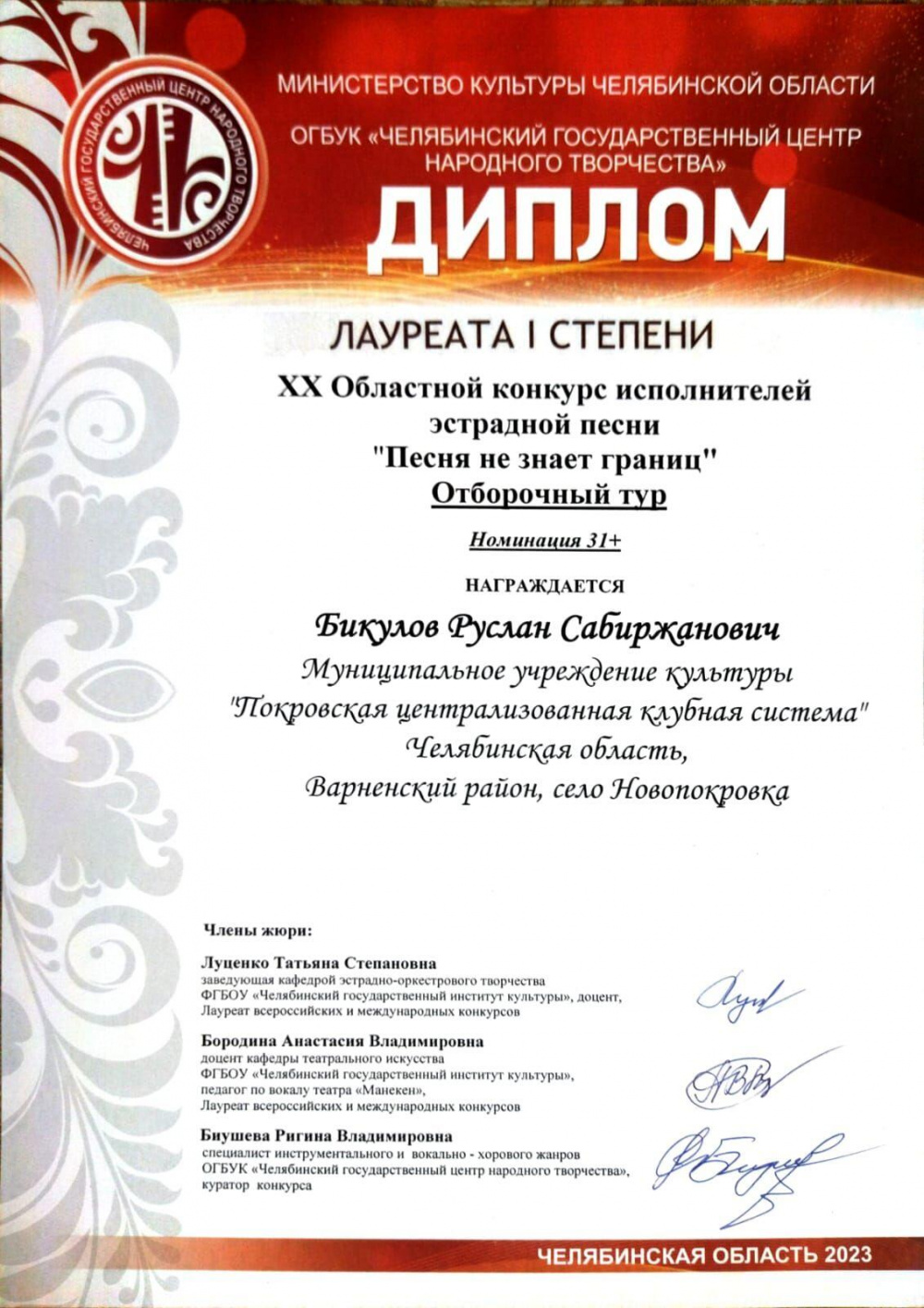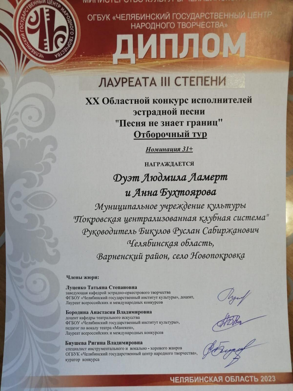 Участники КДФ ДК п. Новопокровка приняли участие в областном конкурсе исполнителей эстрадной песни, который проходил в с. Чесма. Вокальная группа «Эксперимент» за свое выступление получила диплом 1 степени, дуэт - А. Бухтоярова, Л. Ламерт стали лауреатами 3 степени, Бикулов Р.С. получил диплом лауреата 1 степени.