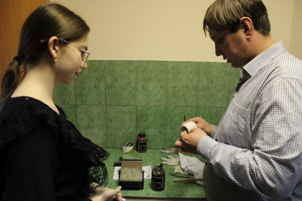 Эксперт - криминалист майор полиции Александр Коннов рассказал о своей работе. У ребят вызвал живой интерес процесс обнаружения, фиксации и изъятия отпечатков пальцев рук, им была предоставлена возможность самим попробовать себя в роли криминалиста обнаружить следы биологического происхождения, найти которые обычному глазу невозможно, а также как с помощью магнитного порошка и кисточки получить образцы отпечатков пальцев.