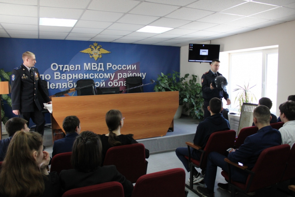 Очередную экскурсию со школьниками по отделу полиции провели заместитель начальника - начальник отделения по работе с личным составом ОМВД России по Варненскому району, подполковник полиции Алексей Никуленков и председатель Совета ветеранов майор юстиции в отставке Алексей Коннов.