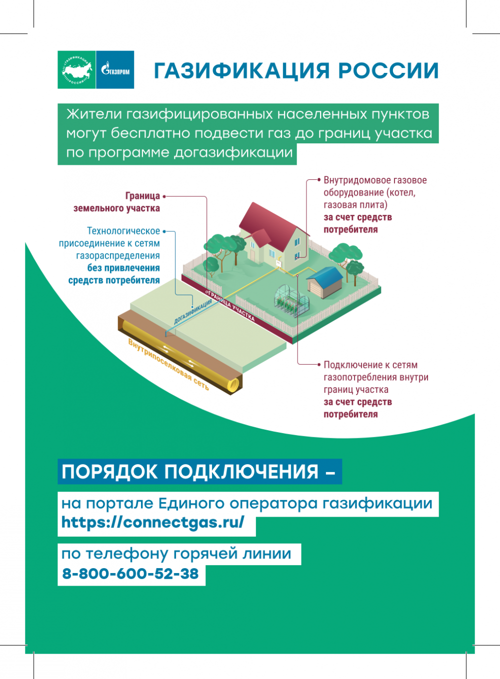 «Догазификация» - подведение газораспределительных сетей до границы земельного участка, принадлежащего физическим лицам, намеревающимся использовать газ для удовлетворения личных, семейных, домашних и иных нужд, не связанных с осуществлением предпринимательской (профессиональной) деятельности, в газифицированных населенных пунктах, без привлечения средств граждан. Протяженность подключения от основного газопровода до границ земельного участка не должна превышать 200м.