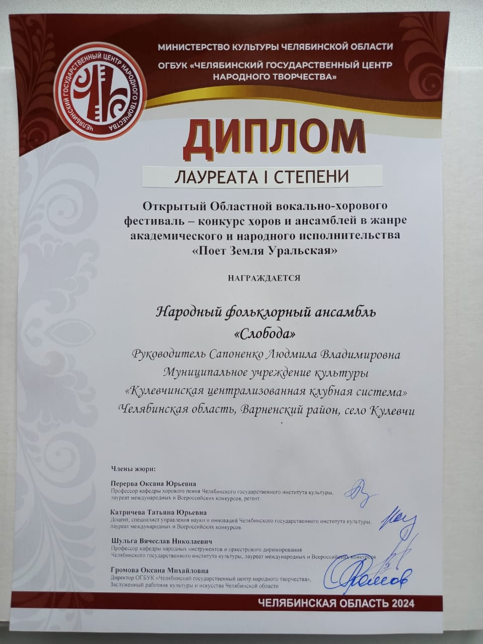 13 апреля 2024 г. народный фольклорный коллектив «Слобода» из п. Кулевчи (руководитель Людмила Сапоненко) принял участие в областном вокально - хоровом фестивале – конкурсе хоров и ансамблей в жанре академического и народного исполнительства «Поёт Земля Уральская». Фестиваль проходил в г. Южноуральск. Участники ансамбля выступили достойно и получили за свою работу диплом Лауреата I степени.
