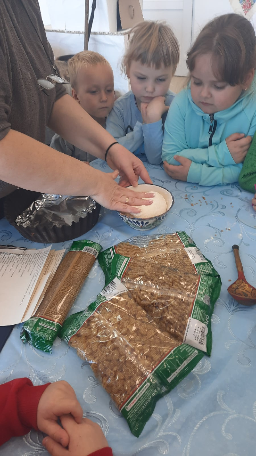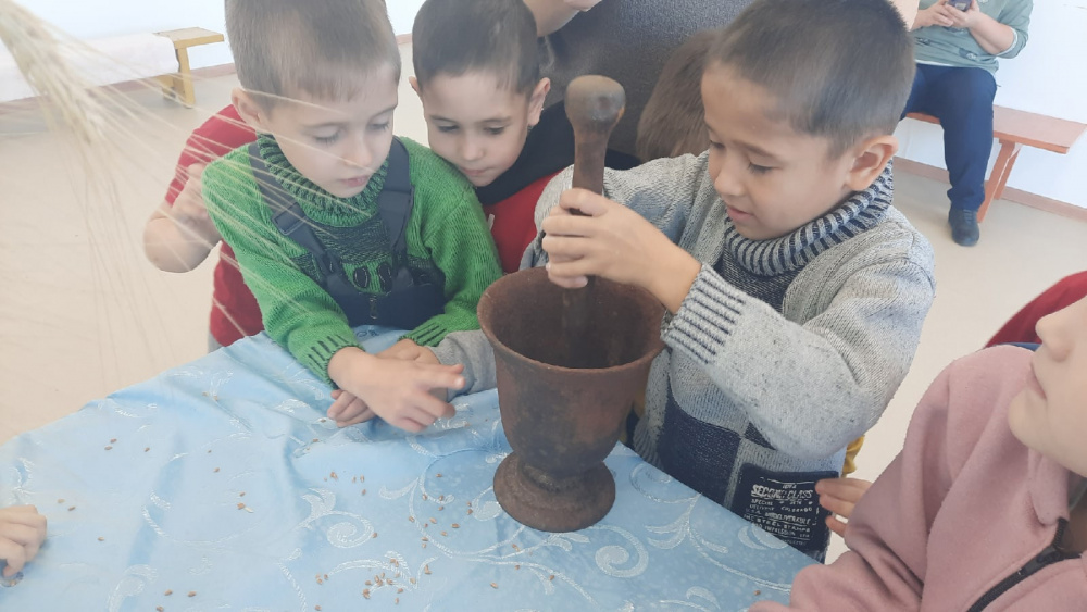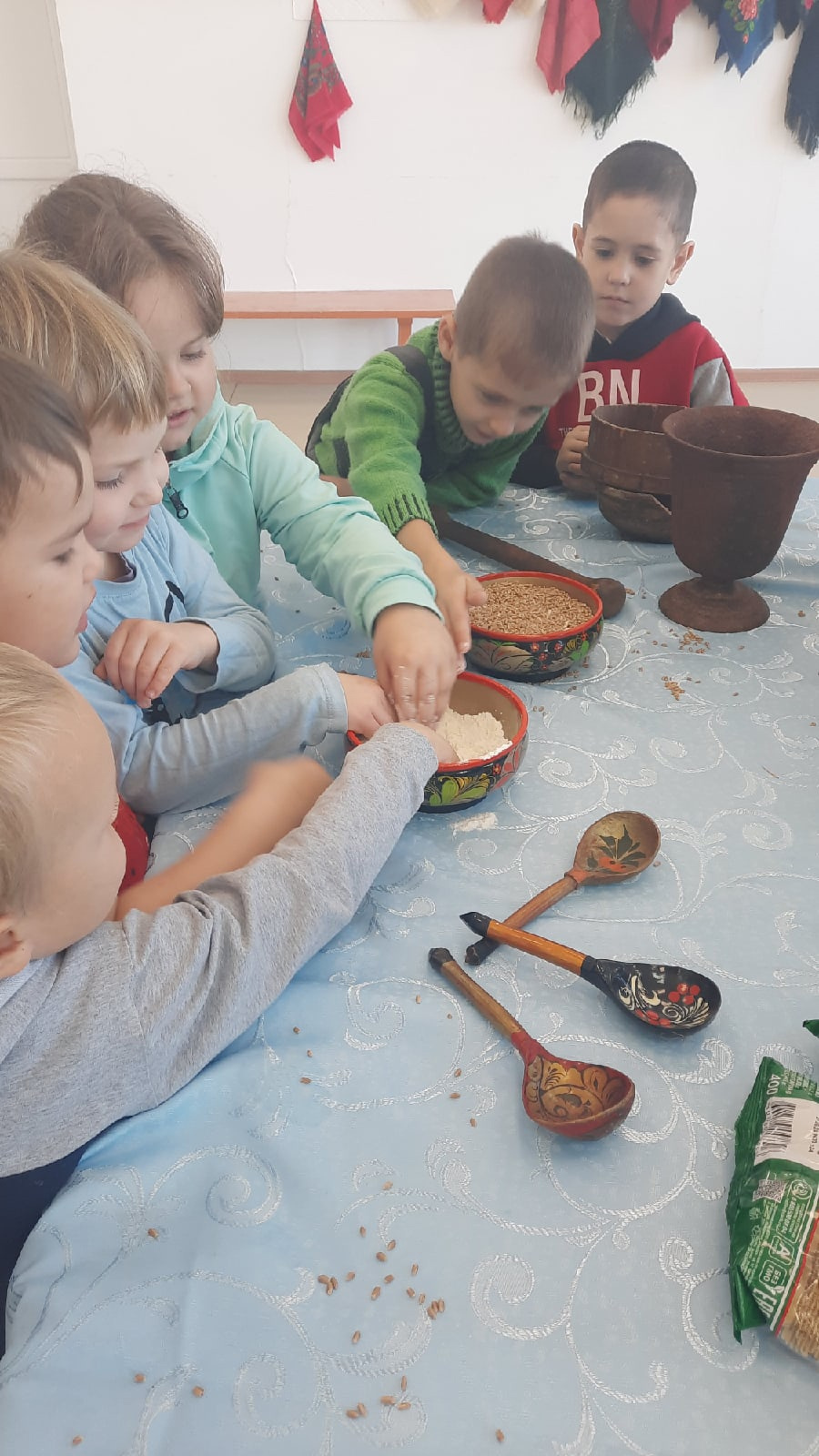 Сегодня, о том, как хлеб пришёл к нам на стол, мы говорили с ребятишками детского садика. Встретились ребята с дедушкой Хлебушко, который рассказал как из маленького зёрнышка получается каравай. Дедушка научил, как закликать дождик и солнышко, чтобы был хороший урожай пшеницы. Ребятишки ушли, получив гостинцы от доброго волшебника.